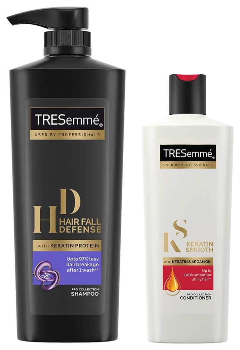 TRESemme Hair Fall Defence Shampoo 580 ml With Keratin for Hair Fall Control and Longer Stronger Hair - Anti Hairfall for Damaged Hair Men & WomenTRESemmé Hair Fall Defense Shampoo works best on damaged and breakage-prone hair. It helps reinforce hair strength and prevents hair fall due to breakage giving you longer and stronger hair. Enriched with Keratin protein TRESemmé Hair Fall Defense Shampoo gives upto 97% less hair breakage after one wash. Its advance quality ingredients and scientifically constituted formula will leave you with longer stronger and manageable hair. This range has been carefully selected for its advanced formula. It is extremely beneficial for damaged hair prone to easy breakage. The Keratin in this hair shampoo helps in strengthening your hair and provides hydration as well as elasticity to your hair. TRESemmé Hair Fall Defense Shampoo is especially formulated for Indian hair and is suitable for use in conjunction with oil treatments. Give your hair a luscious confident bounce and salon quality smoothness without the salon price tag! Buy now to control hair breakage and prevent hair fall happening due to breakage. For best results use this shampoo along with the TRESemmé Hair Fall Defense Conditioner. Shampoo for men and women. To use: Apply gently to wet hair and massage to work into a lather. Rinse thoroughly. For an extra boost of protection follow with TRESemmé Hair Fall Defense Conditioner.TRESemme Smooth & Shine Conditioner 335 mlDeep condition your hair and protect them from damage to get smoother hair with the TRESemmé Keratin Smooth Conditioner. With its lower sulfate formulation it helps restore keratin in your hair and nourishes its every strand to leave your hair straighter and shinier. Infused with Keratin and light-weight Argan oil this nourishing conditioner can make your hair visibly straight and smoother. The Keratin-Argan Oil formulation conditions and strengthens your hair as well as provides them the hydration and elasticity that they need. With its dual action TRESemmé Keratin Smooth professional conditioner can make your hair up to 100% smoother and give them extra shine. It is suitable for use for both naturally and chemically treated hair. When used together with the TRESemmé Keratin Smooth Shampoo it controls frizz for up to 3 amazing days helping you tame your frizz and giving you silky smooth hair. So say no to frizzy hair and say yes to gorgeous salon smooth hair without the salon price tag! Suitable for both men & women. To use: After shampoo apply an adequate amount of TRESemmé Keratin Smooth Conditioner from mid-lengths to the ends. Leave it on for 2-3 minutes and let it work its magic. Rinse your hair thoroughly with lukewarm water. For best results use with TRESemmé Keratin Smooth Shampoo.