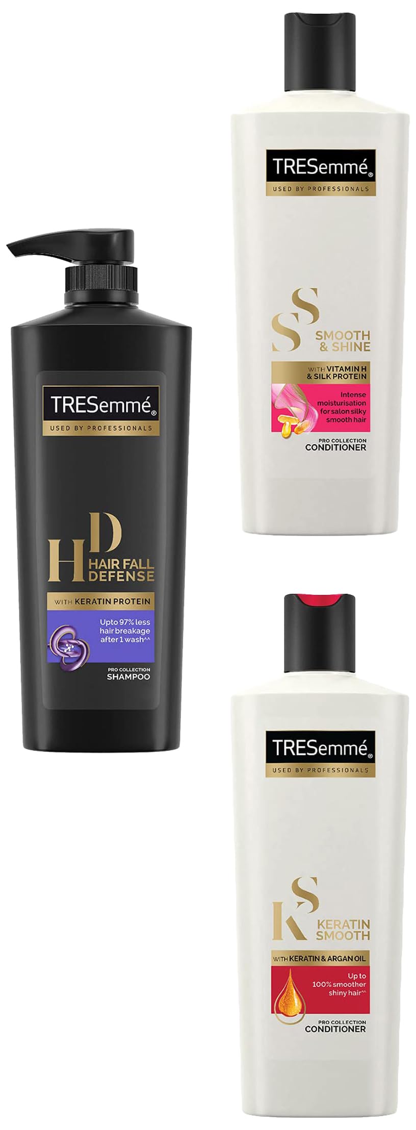 TRESemme Hair Fall Defence Shampoo 580 ml With Keratin for Hair Fall Control and Longer Stronger Hair - Anti Hairfall for Damaged Hair Men & WomenTRESemmé Hair Fall Defense Shampoo works best on damaged and breakage-prone hair. It helps reinforce hair strength and prevents hair fall due to breakage giving you longer and stronger hair. Enriched with Keratin protein TRESemmé Hair Fall Defense Shampoo gives upto 97% less hair breakage after one wash. Its advance quality ingredients and scientifically constituted formula will leave you with longer stronger and manageable hair. This range has been carefully selected for its advanced formula. It is extremely beneficial for damaged hair prone to easy breakage. The Keratin in this hair shampoo helps in strengthening your hair and provides hydration as well as elasticity to your hair. TRESemmé Hair Fall Defense Shampoo is especially formulated for Indian hair and is suitable for use in conjunction with oil treatments. Give your hair a luscious confident bounce and salon quality smoothness without the salon price tag! Buy now to control hair breakage and prevent hair fall happening due to breakage. For best results use this shampoo along with the TRESemmé Hair Fall Defense Conditioner. Shampoo for men and women. To use: Apply gently to wet hair and massage to work into a lather. Rinse thoroughly. For an extra boost of protection follow with TRESemmé Hair Fall Defense Conditioner.TRESemme Smooth & Shine Conditioner 335 ml With Biotin & Silk Proteins For Silky Smooth Hair - Deeply Moisturises Dry & Frizzy Hair For Men & WomenTRESemmé Smooth & Shine Conditioner intensely moisturizes dry rough hair and makes them detangled manageable shiny & smooth. Infused with Vitamin H and Silk Protein this deep moisturizing conditioner can tame unruly strands and give you up to 7x smoother hair. Vitamin H which is also known as Biotin plays an important role in maintaining the health of your hair while Silk Protein helps in moisturizing hair and improving its elasticity. Its advanced smoothing system is also enriched with light-weight Moroccan Argan oil to help you get salon silky smooth hair which is beautifully soft to touch. It is also great for controlling frizz and flyaways without weighing your hair down. The TRESemmé Smooth & Shine professional conditioner is especially formulated for Indian hair and is suitable for use in conjunction with any oil treatments. Buy now to make your tresses shinier easy to style and salon like silky smooth without the salon price tag! Suitable for both men & women. To use: After shampoo apply an adequate amount of TRESemmé Smooth & Shine Conditioner from mid-lengths to the ends. Leave it on for 2-3 minutes and let it work its magic. Rinse your hair thoroughly with lukewarm water. For best results use after TRESemmé Smooth & Shine Shampoo.TRESemme Keratin Smooth Conditioner 335 ml With Keratin & Argan Oil for Straight Shiny Hair - Nourishes Dry Hair & Controls Frizz For Men & WomenDeep condition your hair and protect them from damage to get smoother hair with the TRESemmé Keratin Smooth Conditioner. With its lower sulfate formulation it helps restore keratin in your hair and nourishes its every strand to leave your hair straighter and shinier. Infused with Keratin and light-weight Argan oil this nourishing conditioner can make your hair visibly straight and smoother. The Keratin-Argan Oil formulation conditions and strengthens your hair as well as provides them the hydration and elasticity that they need. With its dual action TRESemmé Keratin Smooth professional conditioner can make your hair up to 100% smoother and give them extra shine. It is suitable for use for both naturally and chemically treated hair. When used together with the TRESemmé Keratin Smooth Shampoo it controls frizz for up to 3 amazing days helping you tame your frizz and giving you silky smooth hair. So say no to frizzy hair and say yes to gorgeous salon smooth hair without the salon price tag! Suitable for both men & women. To use: After shampoo apply an adequate amount of TRESemmé Keratin Smooth Conditioner from mid-lengths to the ends. Leave it on for 2-3 minutes and let it work its magic. Rinse your hair thoroughly with lukewarm water. For best results use with TRESemmé Keratin Smooth Shampoo.