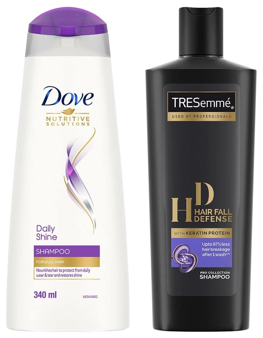 TRESemme Hair Fall Defense Shampoo 340mlLaunched in 1948 TRESemmé was named after renowned hair care expert Edna Emmé. Up until the 1950's TRESemmé was sold only in salons. Today it is available at a shop near you so that you can have salon style hair at home. For over 60 years TRESemmé has built a history of success in 13 countries around the world. From its origins in 1947 and salon expertise TRESemme has been driven by a simple truth: every woman deserves to look & feel fabulous like she has just stepped out of the salon everyday. This range has been carefully selected for its advanced formula. Driven by our salon heritage we work with our stylists to deliver expert solutions from salon quality products without the salon price tag. Our salon inspired products enriched with high quality ingredients help you experience that salon feeling everyday. The Tresemme Hair Fall Defense Shampoo helps reinforce your hair strength and prevents hair fall due to breakage. For longer and stronger hair. Enriched with advanced quality ingredients the formula is scientifically constituted to give you longer stronger & manageable hair with every wash. It works best on damaged and breakage-prone hair.Get this bottle of 200 ml now and give your hair a luscious confident bounce. For best results use daily with TRESemme Hair Fall Defense Conditioner.Dove Daily Shine Shampoo 340mlThe mystery of how to get shiny hair isn't a tricky one to solve. The key to getting shiny damage free hair we all long for is making sure your hair is nourished from the start of your routine. That's where Dove daily shine shampoo comes in. Dove daily shine shampoo with nutritive serum builds a protective shield around the hair fibre and defends your hair from daily hair damage. It is a gentle hair cleanser that keeps your hair looking healthy and lustrous. It is mild on your scalp but gives protection from the aggression your hair faces every day. Its nutritive serum absorbs into the hair strands to keep them beautifully nourished and shiny this Dove shampoo surrounds your hair with a protective shield defending it from everyday stresses like brushing and damage. And not only is it gentle enough to use every day over time Dove daily shine shampoo makes your hair better . So as well as cleansing from roots up it helps make your hair look healthy too. The result. Beautifully shiny strong and silky hair which is everything you want it to be. Based on lab test with Dove daily shine system vs non-conditioning shampoo.