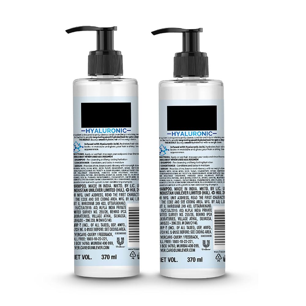Our system is designed to gently cleanse condition and help in retaining moisture in the hair to provide long-lasting smooth hydrated look for upto 3 days^. The result: Bouncy smooth hydrated hair with no weigh down. Infused with Hyaluronic Acid hydrates hair strands locks-in moisture and gives your hair a shiny bouncy appearance Works best when used as a regimen 1. Shampoo - For cleansing and long-lasting hydration 2. Conditioner - Conditions and locks-in moisture 3. Serum - Provides shine bounce and vibrancy with no weigh down ^Based on lab test with system vs non-conditioning shampoo For dry and damaged hair locks. Try Hyaluronic Acid as a: ⢠Natural Humectant ⢠Retains 1000 times itâs weight in water ⢠Retains moisture ⢠Keeps hair hydrated bouncy and vibrant Our gentle formula with hydrating Hyaluronic Acid Humectant Glycerine and Moisturizing Panthenol for bouncy and hydrated hair ⢠0% Parabens Sulphates and Mineral Oil ⢠PETA Approved ⢠Dermatologically Tested Hyaluronic Acid is best used for: ⢠Dull and Dry Hair ⢠Rough and Frizzy Hair ⢠Health exposed and Styled Hair TRESemme Hyaluronic Acid provides upto 3x Hydrated Hair from The First Wash. Experience impactful results on dull and dry hair provide long-lasting smooth hydrated look for upto 3 days^.