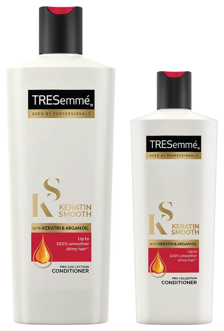TRESemme Keratin Smooth Conditioner 335 ml With Keratin & Argan Oil for Straight Shiny Hair - Nourishes Dry Hair & Controls Frizz For Men & WomenDeep condition your hair and protect them from damage to get smoother hair with the TRESemmé Keratin Smooth Conditioner. With its lower sulfate formulation it helps restore keratin in your hair and nourishes its every strand to leave your hair straighter and shinier. Infused with Keratin and light-weight Argan oil this nourishing conditioner can make your hair visibly straight and smoother. The Keratin-Argan Oil formulation conditions and strengthens your hair as well as provides them the hydration and elasticity that they need. With its dual action TRESemmé Keratin Smooth professional conditioner can make your hair up to 100% smoother and give them extra shine. It is suitable for use for both naturally and chemically treated hair. When used together with the TRESemmé Keratin Smooth Shampoo it controls frizz for up to 3 amazing days helping you tame your frizz and giving you silky smooth hair. So say no to frizzy hair and say yes to gorgeous salon smooth hair without the salon price tag! Suitable for both men & women. To use: After shampoo apply an adequate amount of TRESemmé Keratin Smooth Conditioner from mid-lengths to the ends. Leave it on for 2-3 minutes and let it work its magic. Rinse your hair thoroughly with lukewarm water. For best results use with TRESemmé Keratin Smooth Shampoo.TRESemme Keratin Smooth Conditioner 190 ml With Keratin & Argan Oil for Straight Shiny Hair - Nourishes Dry Hair & Controls Frizz For Men & WomenDeep condition your hair and protect them from damage to get smoother hair with the TRESemmé Keratin Smooth Conditioner. With its lower sulfate formulation it helps restore keratin in your hair and nourishes its every strand to leave your hair straighter and shinier. Infused with Keratin and light-weight Argan oil this nourishing conditioner can make your hair visibly straight and smoother. The Keratin-Argan Oil formulation conditions and strengthens your hair as well as provides them the hydration and elasticity that they need. With its dual action TRESemmé Keratin Smooth professional conditioner can make your hair up to 100% smoother and give them extra shine. It is suitable for use for both naturally and chemically treated hair. When used together with the TRESemmé Keratin Smooth Shampoo it controls frizz for up to 3 amazing days helping you tame your frizz and giving you silky smooth hair. So say no to frizzy hair and say yes to gorgeous salon smooth hair without the salon price tag! Suitable for both men & women. To use: After shampoo apply an adequate amount of TRESemmé Keratin Smooth Conditioner from mid-lengths to the ends. Leave it on for 2-3 minutes and let it work its magic. Rinse your hair thoroughly with lukewarm water. For best results use with TRESemmé Keratin Smooth Shampoo.