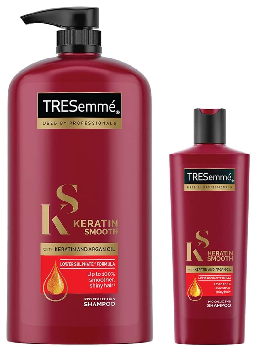 Tresemme Keratin Smooth ShampooWith Keratin And Argan Oil For Smoother And Shinier Hair 1 LtrTRESemmé Keratin Smooth Shampoo helps your hair restore its keratin leaving them visibly straight and smoother. Infused with light-weight Argan Oil this professional shampoo nourishes each strand of your hair making them silky smooth and easier to manage. This unique combination of Keratin and Argan Oil conditions and strengthens your hair and provides them hydration and elasticity. With its dual action TRESemmé Keratin Smooth Shampoo helps you get up to 100% smoother hair with more shine. Its lower sulfate formulation and patented micro-moisture technology smoothens and protects dry hair from damage. When used together with the TRESemmé Keratin Smooth Conditioner this nourishing shampoo can control frizz for as long as upto 3 days. Recommended by professionals the TRESemmé Keratin Smooth Shampoo is especially formulated for Indian hair and is suitable for both naturally and chemically treated hair. It is also suitable for use in conjunction with any oil treatments. Now get visibly straighter smoother hair that is easier to style hair. Buy now to enjoy gorgeous salon-quality smooth hair everyday without the salon price tag! Suitable for both men and women. To use: Apply to wet hair and gently massage to work into a lather. Rinse hair thoroughly. Follow with the TRESemmé Keratin Smooth conditioner for an extra boost of smoothness.TRESemme Keratin Smooth Shampoo 340 ml With Keratin & Argan Oil for Straighter Shinier Hair - Nourishes Dry Hair & Controls Frizz For Men & WomenTRESemmé Keratin Smooth Shampoo helps your hair restore its keratin leaving them visibly straight and smoother. Infused with light-weight Argan Oil this professional shampoo nourishes each strand of your hair making them silky smooth and easier to manage. This unique combination of Keratin and Argan Oil conditions and strengthens your hair and provides them hydration and elasticity. With its dual action TRESemmé Keratin Smooth Shampoo helps you get up to 100% smoother hair with more shine. Its lower sulfate formulation and patented micro-moisture technology smoothens and protects dry hair from damage. When used together with the TRESemmé Keratin Smooth Conditioner this nourishing shampoo can control frizz for as long as upto 3 days. Recommended by professionals the TRESemmé Keratin Smooth Shampoo is especially formulated for Indian hair and is suitable for both naturally and chemically treated hair. It is also suitable for use in conjunction with any oil treatments. Now get visibly straighter smoother hair that is easier to style hair. Buy now to enjoy gorgeous salon-quality smooth hair everyday without the salon price tag! Suitable for both men and women. To use: Apply to wet hair and gently massage to work into a lather. Rinse hair thoroughly. Follow with the TRESemmé Keratin Smooth conditioner for an extra boost of smoothness.