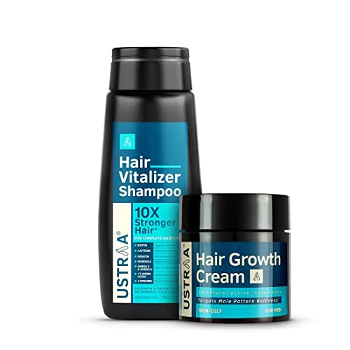 Ustraa Hair Vitalizer Shampoo - When it comes to fighting weak falling hair your scalp needs the best nourishment and cleansing. This product is the Power of 26 nutrients: which help to keep your hair Healthy help improve hair strength and help strengthen hair roots. Ustraa Hair Growth Cream - We took the best of modern-day science Ancient Ayurveda knowledge of Unani medicines and clubbed it together to create a unique proprietary blend. Power packed with 15 ingredients like Saw Palmetto Onion Extracts Neelbhringadi Tailam Coffee Bean Extracts Black Seed Oil Aloe Vera Coconut and more this cream is just what your Hair Needs.