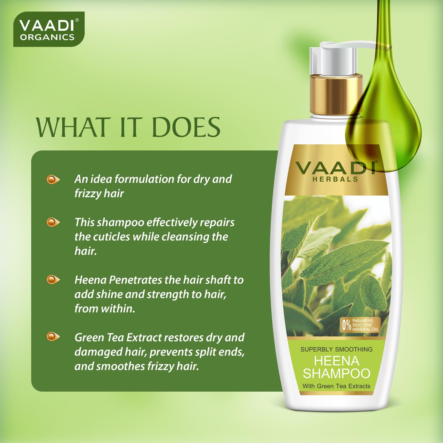 The shampoo in this combination is an ideal formulation for dry and frizzy hair and effectively repairs cuticles while cleansing the hair. Heena and green tea extract restore dry damaged hair while softening unruly frizzy hair.