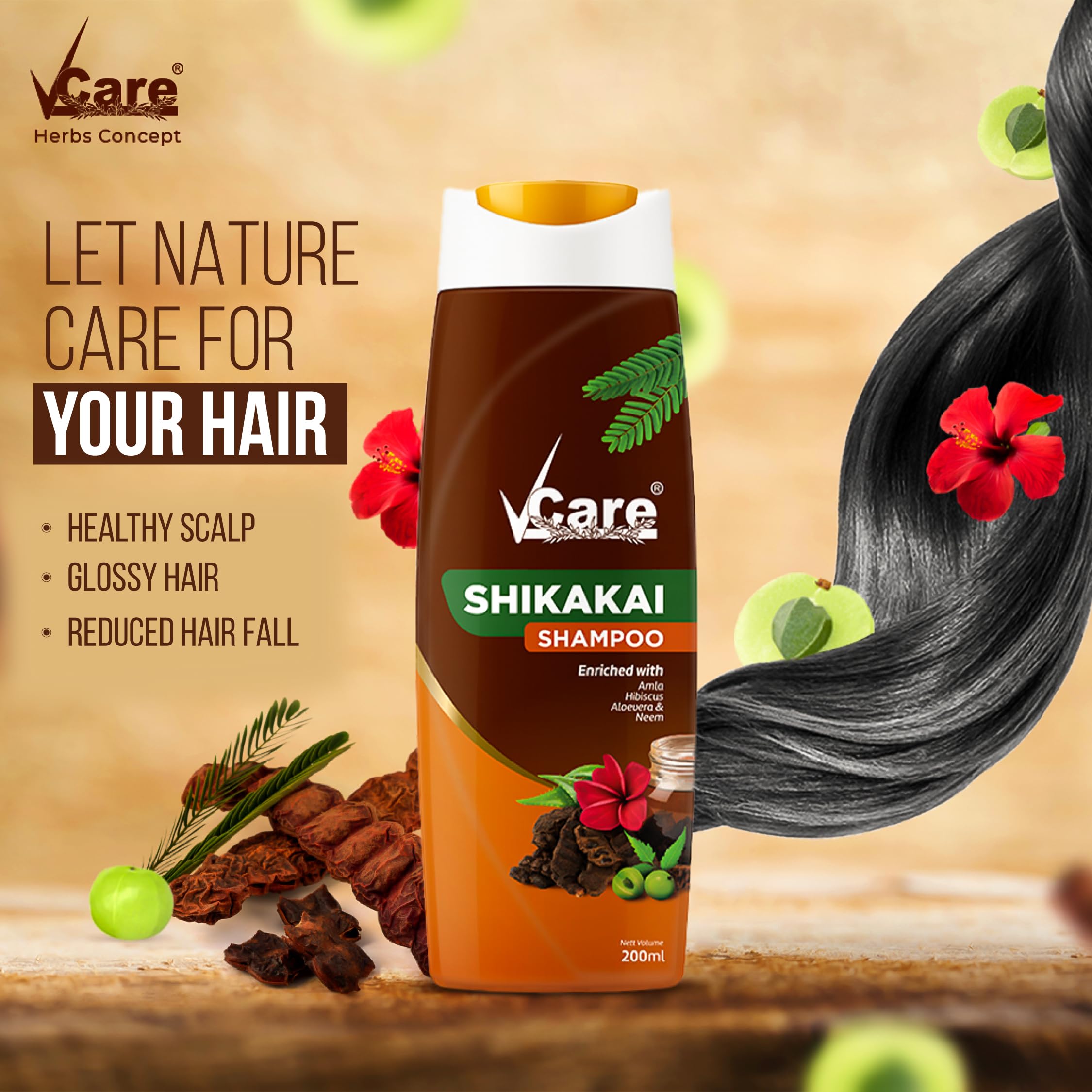VCare Shikakai Shampoo with Goodness of Aloe Vera & Neem, Amla, Hibiscus, Shikakai Shampoo 200ml, pk-1