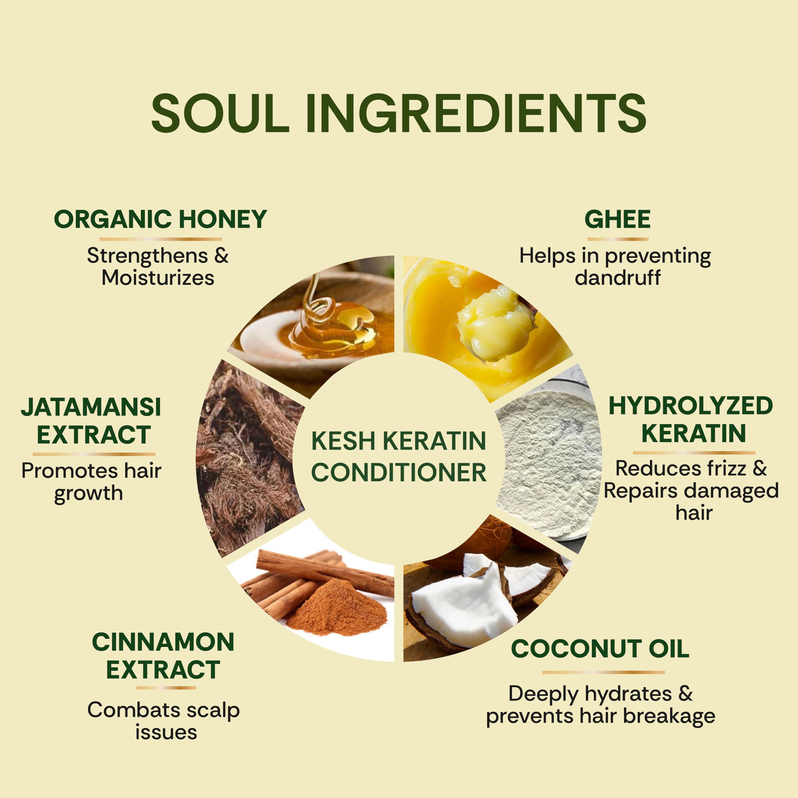 KEY INGREDIENTS - Organic Honey Ginger Lily Extract Licorice Extract Jatamansi Extract Ghee Protein Extract Neelibhringadi Oil Shea Butter Hydrolyzed Baobab Protein Argan Oil Provitamin B5 Biotin Coconut Milk Collagen Silk Protein Camellia Seed Oil Marul