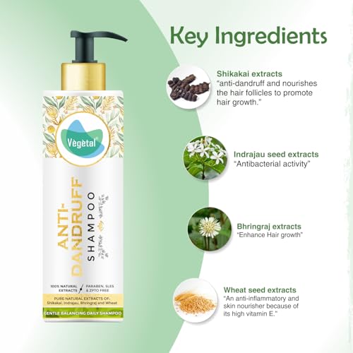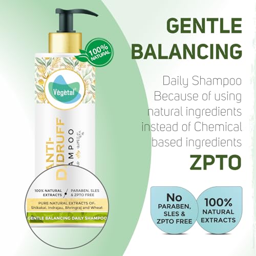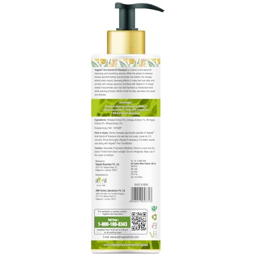. Bioactive extract of Shikakai & Wheat 2. Reduces dandruff falling and greying of hair 3. provides relief from Itchy and Irritated Scalps 4. 100% Bio-natural extracts 5. All Hair types Vegetal Anti Dandruff Shampoo is blend of anti-dandruff cleansing and nourishing extracts like shikakai having anti-dandruff activity and promote hair follicle. Indrajau extract is enriched with natural saponins that has natural cleansing effects and hair looks silky and smooth. It also enriched with Vit.E of wheat seed for rejuvenation of hair and keeps your hair look moisturized while averting dryness. Bio-pharma active ingredients: Acacia concinna (Shikakai) fruit extract: Rich source of Saponins vitamin C & D and other micronutrients that provides anti-dandruff and nourishes the hair follicles to promote hair growth. Holarrhena antidysentrica (Indrajau) seed extract: Contains flavonoids which is responsible for Antibacterial activity Eclipta alba (Bhringraj) plant extract: Enhance Hair growth Triticum sativum (Wheat) seed extract: An anti-inflammatory and skin nourisher because of its high vitamin E. . Usage: Reduces flakes Itching Hair fall and Prevent the recurrence of dandruff Direction of Use: Gently massage appropriate quantity of Vegetal antidandruff shampoo into wet hair and scalp. Leave for 2 - 3 minutes. Rinse thoroughly. Repeat if necessary. For better result use along with Vegetal Hair Conditioner. Net Wt.: 200ml Ayurvedic Proprietary Medicine Store in a cool and dry place keep it away from direct sunlight. Do not refrigerate. Keep out of the reach of children