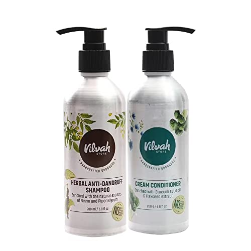 VILVAH Herbal Anti Dandruff Shampoo is a purifying herbal shampoo enriched with clinically proven all-natural bio-actives to completely control the appearance of both dry and oily dandruff. Four traditional power herbs - neem tea tree rosemary and black pepper help to effectively the microbes causing dandruff and balance the scalp. This mild everyday shampoo creates healthy lustrous and bouncy hair and is ideal for colour - treated hair. VILVAH Cream Conditioner is super rich and is uniquely crafted for dry frizzy and damaged hair. This moisturizing conditioning formula with tucuma butter and broccoli oil deeply conditions detangles and guards hair from future breakage. Impressive ingredients in this formula provide an amazing slip and leave the hair soft silky and shiny.