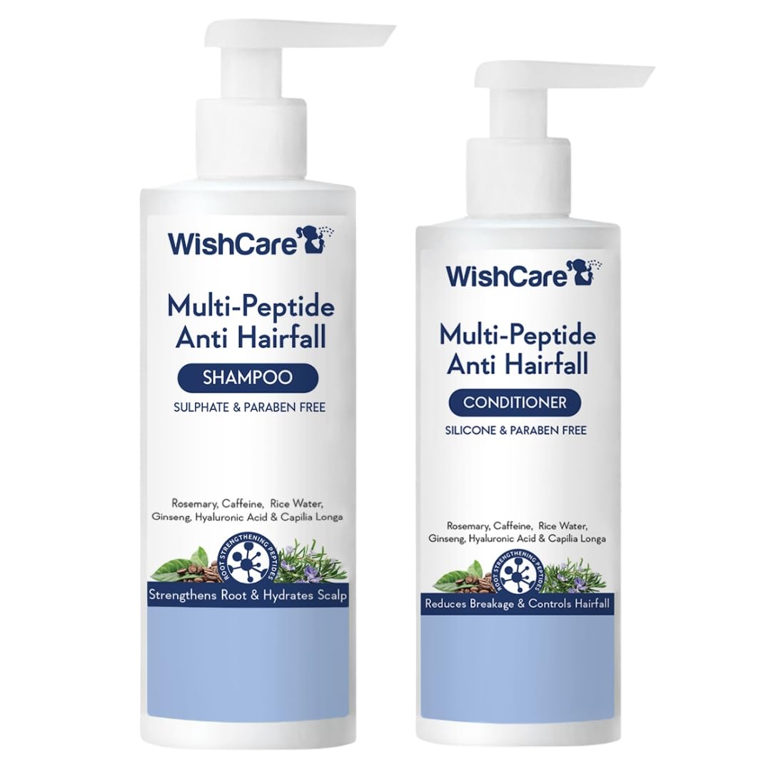 WishCare Multi Peptide Anti Hairfall Shampoo - Rice Water Rosemary Capilia Longa Hyaluronic Acid & Caffeine 250mlWishCare Multi Peptide Anti Hairfall Shampoo is a powerful blend of science forward and natural ingredients designed to promote healthier stronger and more resilient hair. This advanced formula combines the nourishing properties of Rice Water Rosemary Caffeine Ginseng Hyaluronic Acid Capilia Longa Niacinamide and Ceramides to prolong the Anagen phase of the hair cycle thereby reducing hair fall and promoting hair growth. This shampoo also prevents hairfall due to breakage split ends and scalp & strand dryness. It will activate and energize your scalp for overall scalp and hair health and works on root causes of hair fall.WishCare Multi Peptide Anti Hairfall Conditioner - Rice Water Rosemary Capilia Longa Hyaluronic Acid & Caffeine 200mlWishCare Multi Peptide Anti Hairfall Conditioner is a powerful blend of science forward and natural ingredients designed to promote healthier stronger and more resilient hair. This advanced formula combines the nourishing properties of Rice Water Rosemary Caffeine Ginseng Hyaluronic Acid Capilia Longa Niacinamide and Ceramides to prolong the Anagen phase of the hair cycle thereby reducing hair fall and promoting hair growth. This Conditioner also prevents hairfall due to breakage split ends and scalp & strand dryness. It will activate and energize your scalp for overall scalp and hair health and works on root causes of hair fall.