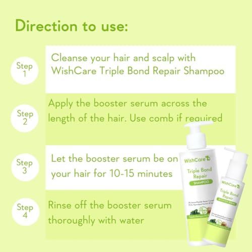WishCare Triple Bond Repair Shampoo - 5% AminoPeptide Complex & PCA - Repairs Damaged & Frizzy Hair 250mlWishCare Triple Bond Repair Shampoo is a first of its kind hair strengthening & maintenance mild hair cleanser that preserves and repairs the broken polypeptide chains in the hair strand. This shampoo contains our proprietary patent pending complex (AminoPeptide Repair Complex ) which is biomimetic in nature and repairs all 3 types of hair bonds present in the hair strands- Disulphide Ionic and Hydrogen bonds. It promises reinforced long lasting strength along the length as well as the width of the hair making it resistant against future damage too. The patented peptide complex works to repair damage from bleach color chemical and heat restoring strength softness smoothness and bounce to the hair.WishCare Triple Bond Repair Booster Serum - 10% AminoPeptide Complex - Repairs Damaged & Frizzy Hair 100mlWishCare Triple Bond Repair Booster Serum is a first of its kind hair strengthening & repairing treatment that repairs the broken polypeptide chains in the hair at the molecular level. This hair booster serum contains our proprietary patent pending complex (AminoPeptide Repair Complex ) which is biomimetic in nature and repairs all 3 types of hair bonds present in the hair strands- Disulphide Ionic and Hydrogen bonds. It promises reinforced long lasting strength along the length as well as the width of the hair making it resistant against future damage too. The patented peptide complex works to repair damage from bleach color chemical and heat restoring strength softness smoothness and bounce to the hair.