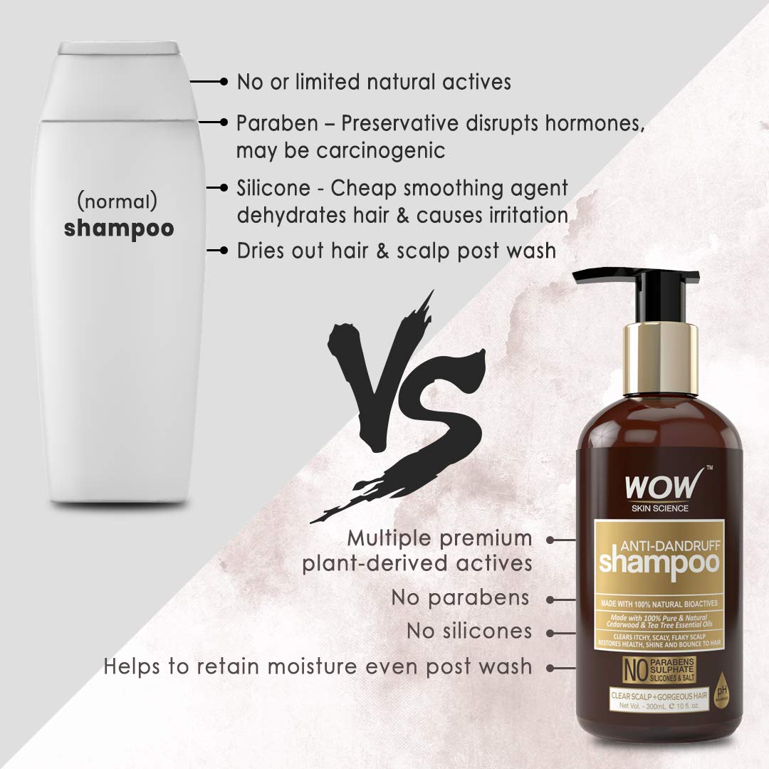 WOW SKIN SCIENCE ANTI-DANDRUFF SHAMPOO is a bestselling shampoo totally free of sulphate paraben mineral oil. Formulated to reduce and remove dandruff from hair and scalp it has been infused with pure essential oils of cedarwood and tea tree. Neutralizes dandruff causing fungus. Gently clears up itchy scaly and flaky scalp to restore health shine and bounce to hair.Recommended for regular use. WOW Skin Science Anti-Dandruff Shampoo contains 100% pure cedarwood and tea tree essential oils that are natureâs own antiseptic and antifungal treatments tough on dandruff yet gentle on hair and scalp. Together these neutralize dandruff causing fungus (scientifically called Malassezia globosa) unclog hair roots of dead cells and flakes to heck spread of dandruff and leave your hair and scalp feeling clean clear and free of itches and flakes. WOW Skin Science Anti-Dandruff Shampoo also contains soya protein almond protein shea butter and Moroccan argan oil to moisturize hydrate and condition your hair. Regular use leaves your scalp and hair free of dandruff and beautifully healthy. Your hair shines and so do you.