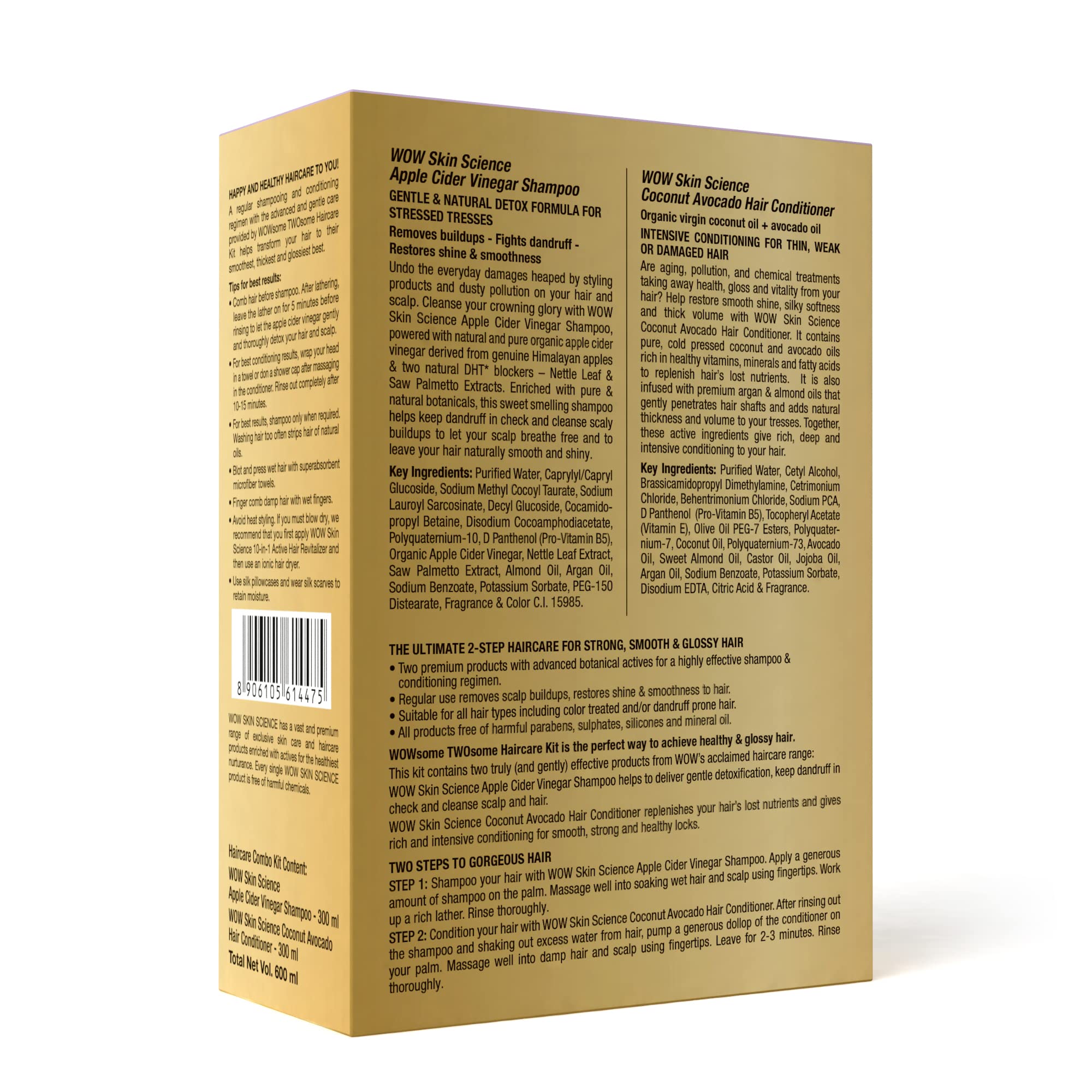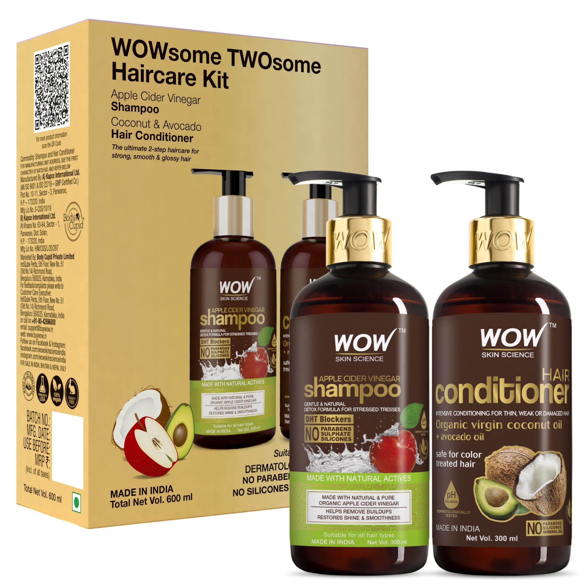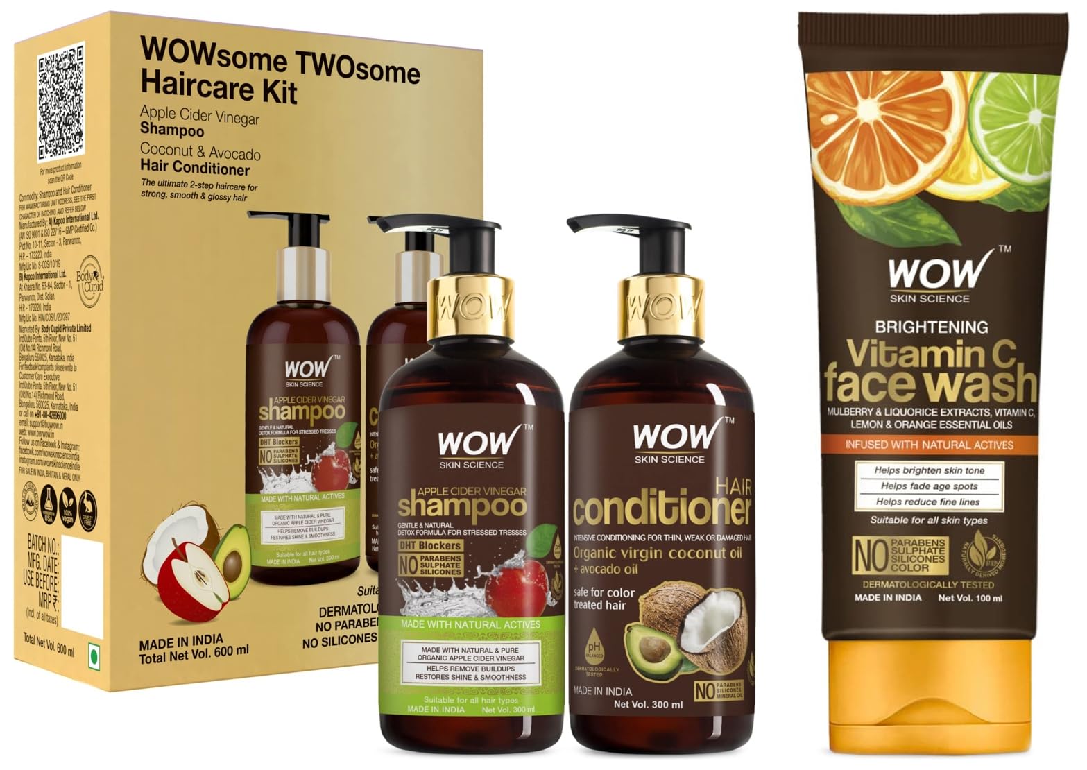 WOW Skin Science Apple Cider Vinegar Shampoo And Coconut + Avocado Oil Conditioner| Strong & Smooth Hair | Paraben & Sulphate Free | Hair Care Kit - 600 MlWOW Skin Science Apple Cider Vinegar gentle & natural detox formula for stressed tresses removes buildups. restores shine & smoothness. made with natural apple cider vinegar. Enhanced with pure apple extracts. Haircare contains no sulphates or paraben undo the everyday damages heaped by styling products and dusty pollution on your hair and scalp. Cleanse your crowning glory with wow apple cider shampoo that comes powered with organic and pure apple cider derived from genuine himalayan apples. Softly scented with natural apple extractsthis sweet smelling shampoo gently clears up all buildups to let your scalp breathe free and to leave your hair naturally smooth and shiny.WOW Skin Science Brightening Vitamin C Face Wash | All Skin Types | Glowing Bright Skin | Refreshing | Paraben & Sulphates Free | Face Wash for Women & Men | 100 mlBring brightness and radiance to your complexion with wow skin science vitamin c brightening gel face wash. It comes enriched with extracts of mulberry & liquorice vitamin c and essential oils of lemon &orange. Vitamin c brightens complexion and also promotes collagen synthesis under the skin to reduce fine lines and boost youthful suppleness. Mulberry & liquorice extracts are effective skin lighteners. All in all; your skin receives the precious gift of rejuvenation with every wash. Use this face wash morning and evening to bring brightness and radiance to your skin.