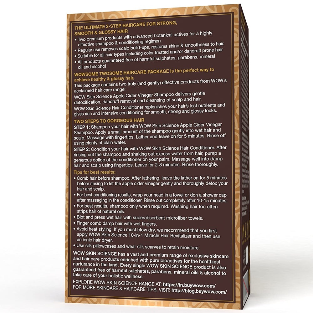 Wow Skin Science Apple Cider Vinegar Shampoo And Hair Conditioner Combo: For Healthy Scalp & Silky, Soft, Dandruff-Free, Flake-Free Hair Combo pack contains- Wow skin science apple cider vinegar shampoo 300 ml + Wow skin science hair conditioner 300 ml Apple Cider Vinegar Shampoo provides healthy hair growth. Hair conditioner decreases hair issues like split ends, breakage, hair fall, frizz and flyaway. Ingredients: Raw Apple Cider Vinegar Argan Oil Almond Oil Coconut Oil Avacado Oil Castor Oil Disclaimer: The product is guaranteed to be 100% genuine. Product images are for illustrative purposes only. Images/packaging/ labels may vary from time to time due to changes made by the manufacturer's manufacturing batch
