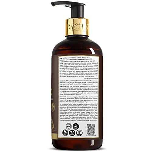 WOW Skin Science Hair Loss Control Therapy Shampoo has a powerful anti-hair loss action that effectively reduces hair fall by naturally blocking the DHT hormone proven by research to be responsible for hair loss. This shampoos twice as powerful formulation contains the very best of Ayurvedic Herbal Extracts Bhringraj (King of Herbs) Amla Neem Henna Shikakai and Lemon and Western Herbal Extracts Biotin Rosemary Saw Palmetto and Niacin for an effective action that doesnt just stop at blocking DHT and reducing hair fall. Its potent pro-hair bioactive ingredients also promote hair growth and improve hair volume. Try it today; this shampoo is the ultimate Hair Loss Control Therapy with multiple hair benefits.