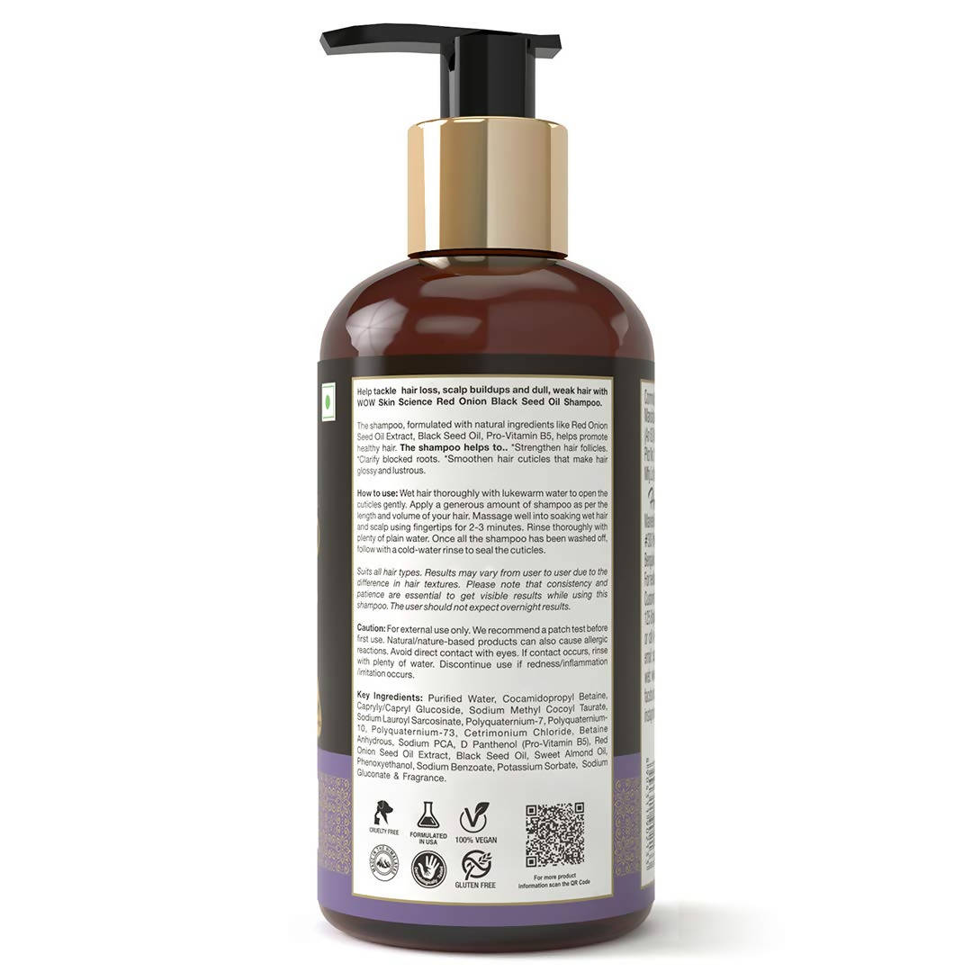 Wow Skin Science Red Onion Black Seed Oil Shampoo 200 ml, 300 ml:This Onion Shampoo helps in hair growth, hair loss issues, scalp buildups, dull and weak hair. WOW Skin Science onion shampoo is formulated with organic ingredients like red onion seed oil extract, black seed oil, sweet almond oil, and pro-vitamin B5 that helps to strengthen hair follicles and clarify blocked roots. Onion Shampoo is suitable for all hair types!Ingredients:Red Onion Seed Oil Extract, Black Seed Oil, Pro-Vitamin B5 (D Panthenol)Directions:Wet hair thoroughly with warm water. Take shampoo in your palm, rub together to emulsify it. Apply on your scalp and hair length. Massage the shampoo into your scalp with mild pressure. Continue for 2 to 3 minutes then rub the lather down the length of your strands to clean them. Rinse your hair well with plenty of warm water; follow with a cool water rinse to seal the cuticles and add smoothness and shine.Disclaimer: The product is guaranteed to be 100% genuine. Product images are for illustrative purposes only. Images/packaging/ labe