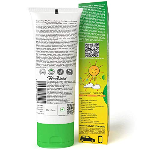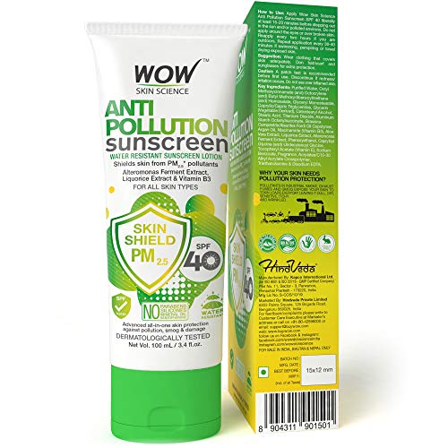 Design:Sunscreen LotionWow anti pollution sunscreen lotion is a broad spectrum water resistant and longer lasting sunscreen with high sun protection factor (spf) count of 40. It gives effective protection from skin damaging uva and uvb sunrays to save the skin from darkening pigmentation and signs of aging. Being water resistant it works for longer even if you have been sweating or swimming. Wow anti pollution sunscreen lotion too is 100 percent vegan/vegetarian cruelty-free and guaranteed free of parabens and mineral oils. It contains clinically proven and totally safe bioactive plant extracts for effective broad spectrum and longer lasting sun protection. Protect your skin from ravages of pollutants smog smoke fuel exhaust and sun's rays with wow skin science anti pollution sunscreen spf 40. It spreads smoothly and evenly to form a shield on your skin that stops pollution particles and sun rays from irritating aging pigmenting and darkening it. The highly effective formulation of wow skin science anti pollution sunscreen has been powered with alteromonas ferment extract from French Polynesian sea waters that contains natural polysaccharides clinically proven to dispel pollutant particles coming in contact with your skin. It also boosts skin's inner healing power to nullify free radicals and rejuvenate skin.