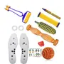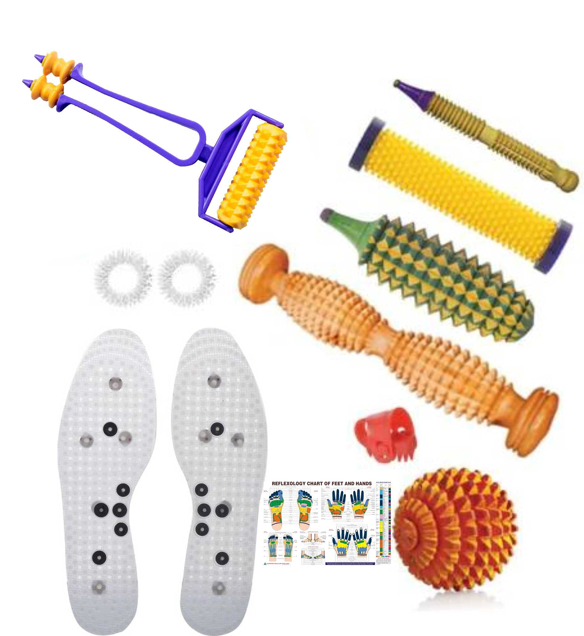 It is a new computerized design with energy centre pyramid yantra orbit and innovative new foot shape design to cover all important pressure points. Warm up your Body by jogging for three to five minutes daily. Morning freshness with total health. Also gives relief in sciatica leg pain cramps heel pain knee pain piles migraine sinus insomnia constipation gastric acidity diabetes indigestion & renal problems | Sujok Ring (Silver) - For pressure of your Fingers Points. Use: Roll it in finger with mild pressure. Designed for thorough stimulation of the finger toes. Regular application enhances your blood circulation & promotes effectiveness on the organ at large. | Energy Ball (Wooden) - For special points of your Hands Foot and Body. Roll in your hands for 5 to 10 minutes daily. Best for middle part of palm & finger relaxation. Stimulates acupressure points activates blood circulation tiredness freshness effective in shoulder pain & total health. This is in pyramidal ball shape. hence it is known as energy-ball. | Acupressure Jimmy - Wooden - For special Su-Jok points f your finger. Use it in Su-Jok treatment. Essential tool for Su-Jok Therapist And Acupressurist. | Karela Roll (Wooden) - For special point of your Hands. Roll in your hands 5 to 10 minutes daily. Stimulates Acupressure points activates blood circulation tiredness freshness & total health. It is made up of standard wood. It is known as wooden karela. | Hand Roll (Soft point) - Pressing all points of Hand and Finger at a time. Roll it over responsive center (hand & foot). The roller is a useful device which is used to stimulate the acupressure points located in the hands. By doing so it is said to benefit various systems in the body such as aiding blood circulation improving digestion renewed energy and pain relief. Do this for about 3-5 minutes daily before meal times for best results. | Shoe Sole - Wonder Height increaser that helps you to increase height naturally by the use o
