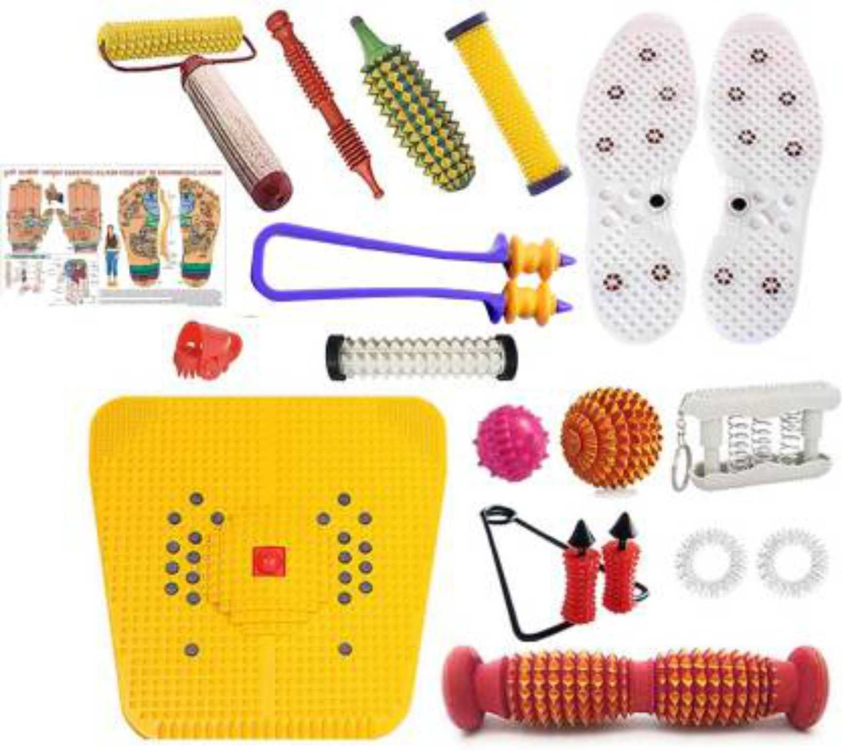 Energy Ball (Wooden) - For special points of your Hands Foot and Body. Roll in your hands for 5 to 10 minutes daily. Best for middle part of palm & finger relaxation. Stimulates acupressure points activates blood circulation tiredness freshness effective in shoulder pain & total health. This is in pyramidal ball shape. hence it is known as energy-ball. | Power Mat - TOP - SELLING PAIN RELIEVER: It is a new computerized design with energy centre pyramid yantra orbit and innovative new foot shape design to cover all important pressure points. Warm up your Body by jogging for three to five minutes daily. Morning freshness with total health. | Acupressure Jimmy - Wooden - For special Su-Jok points f your finger. Use it in Su-Jok treatment. Essential tool for Su-Jok Therapist And Acupressurist. | Sujok Ring (Silver) - For pressure of your Fingers Points. Use: Roll it in finger with mild pressure. Designed for thorough stimulation of the finger toes. Regular application enhances your blood circulation & promotes effectiveness on the organ at large. | Foot roller (Wooden) - Foot Roller for foot relaxation and pain relief. Press & roll your foot over the roller daily 5-10 minutes and warm up your leg. It helps in Arthritis sciatica leg pain gouts and improves digestive system. | Mini Roller (Deluxe) - Effective in joints pain. For cervical spondylitis and Total body massage and relaxation. | Karela Roll (Wooden) - For special point of your Hands. Roll in your hands 5 to 10 minutes daily. Stimulates Acupressure points activates blood circulation tiredness freshness & total health. It is made up of standard wood. It is known as wooden karela. | Hand Roll (Soft point) - Pressing all points of Hand and Finger at a time. Roll it over responsive center (hand & foot). The roller is a useful device which is used to stimulate the acupressure points located in the hands. By doing so it is said to benefit various systems in the body such as aiding blood circulation improvi