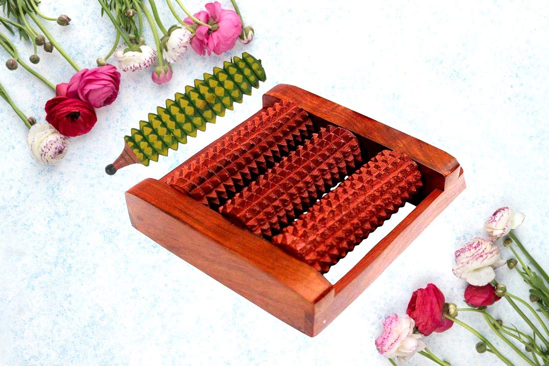 Made from very high quality wood. This product is mainly used for full body massage and helps in maintaining blood pressure. brings you the traditional art of Indian artists by offering you the most beautiful wooden handycraft products made by the rural artists of India Authentic design!! Not a replice!! All are made by Rural Artists of India!! So buy them & promote India. Set of Wooden 3 Roller Foot/Feet Massager for Body Stress Acupressure Feet Care(With Best Quality Surkh Roller) + feet massager + finger cum face massager