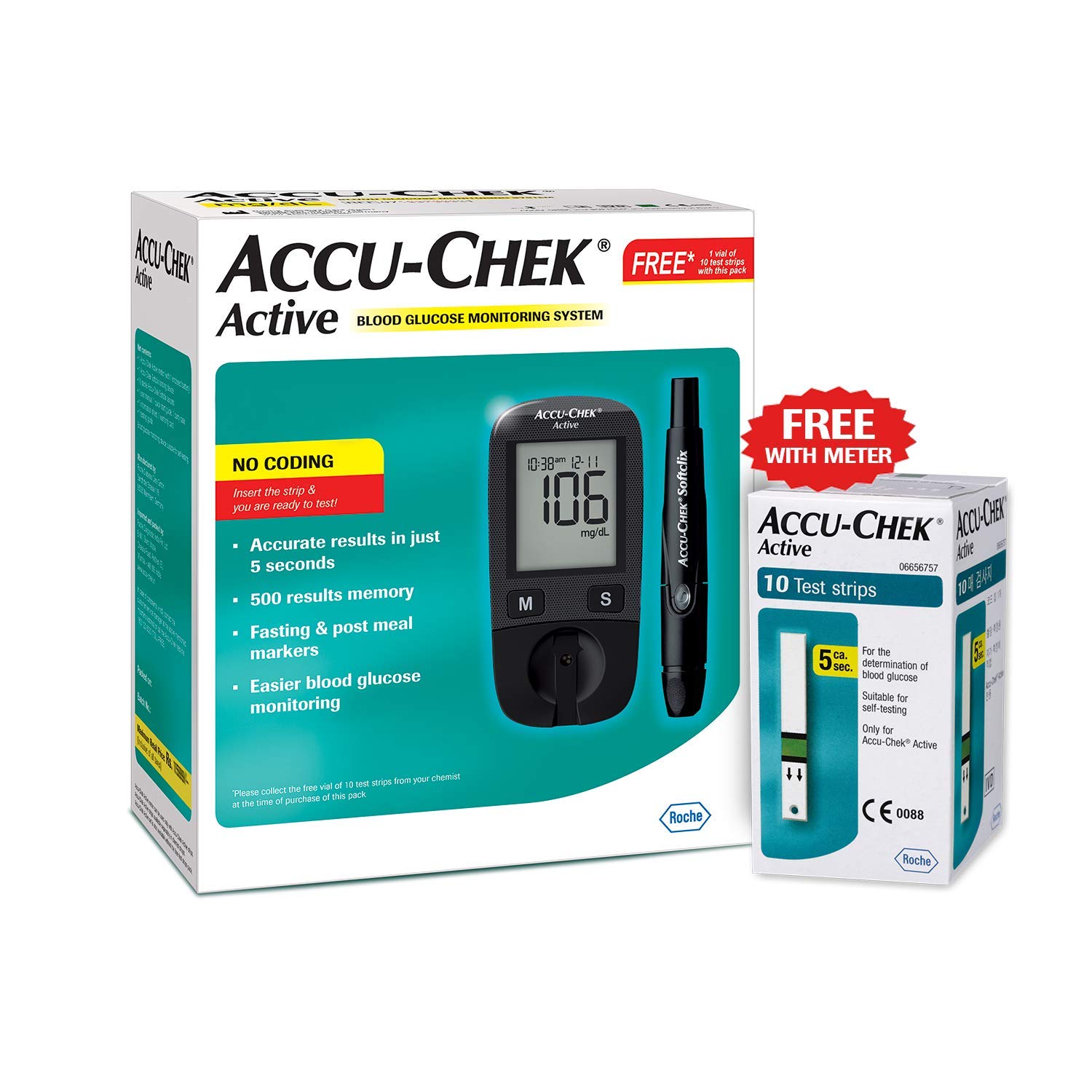 No coding required: Accu-Chek Active blood glucose meter is easy to use as it doesnât require any code chip for coding the meter.