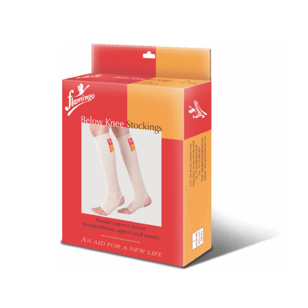 Varicose veins are veins that have become en d and tortuous Characterized by aching pain heaviness inability to walk or stand for long hours thus hindering work ankle swelling and a brownish-blue shiny skin discoloration near the affected veins. Quadriceps strain is an inflammation and pain in the front of the thigh. It is common in sports like running jumping and foot ball. It is caused by trauma fatigue and exercise. It is characterized by pain swelling and warmth over quadriceps muscles muscle spasm or tightness weak ness and fatigue. Flamingo Below Knee Stockings gives you a great relief.