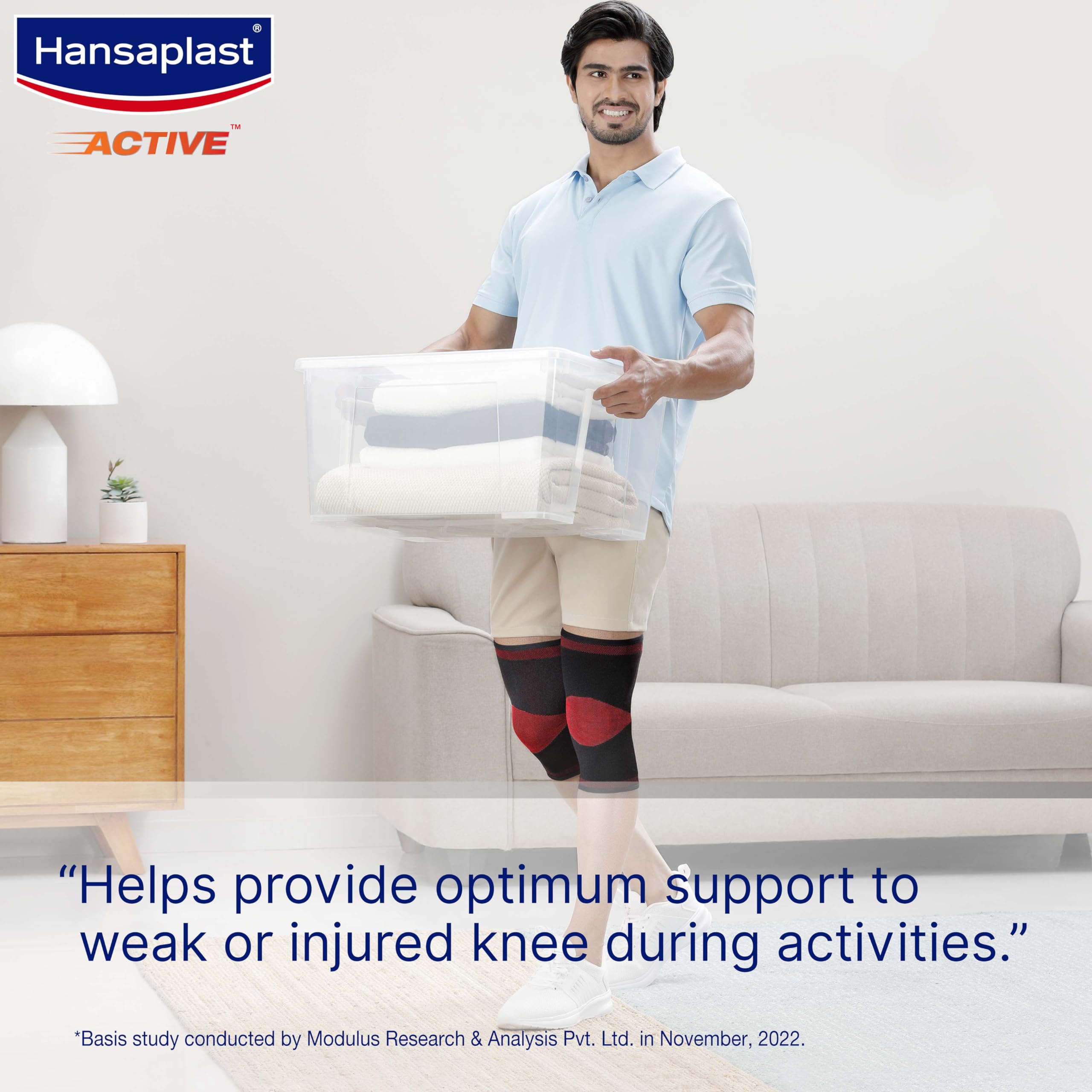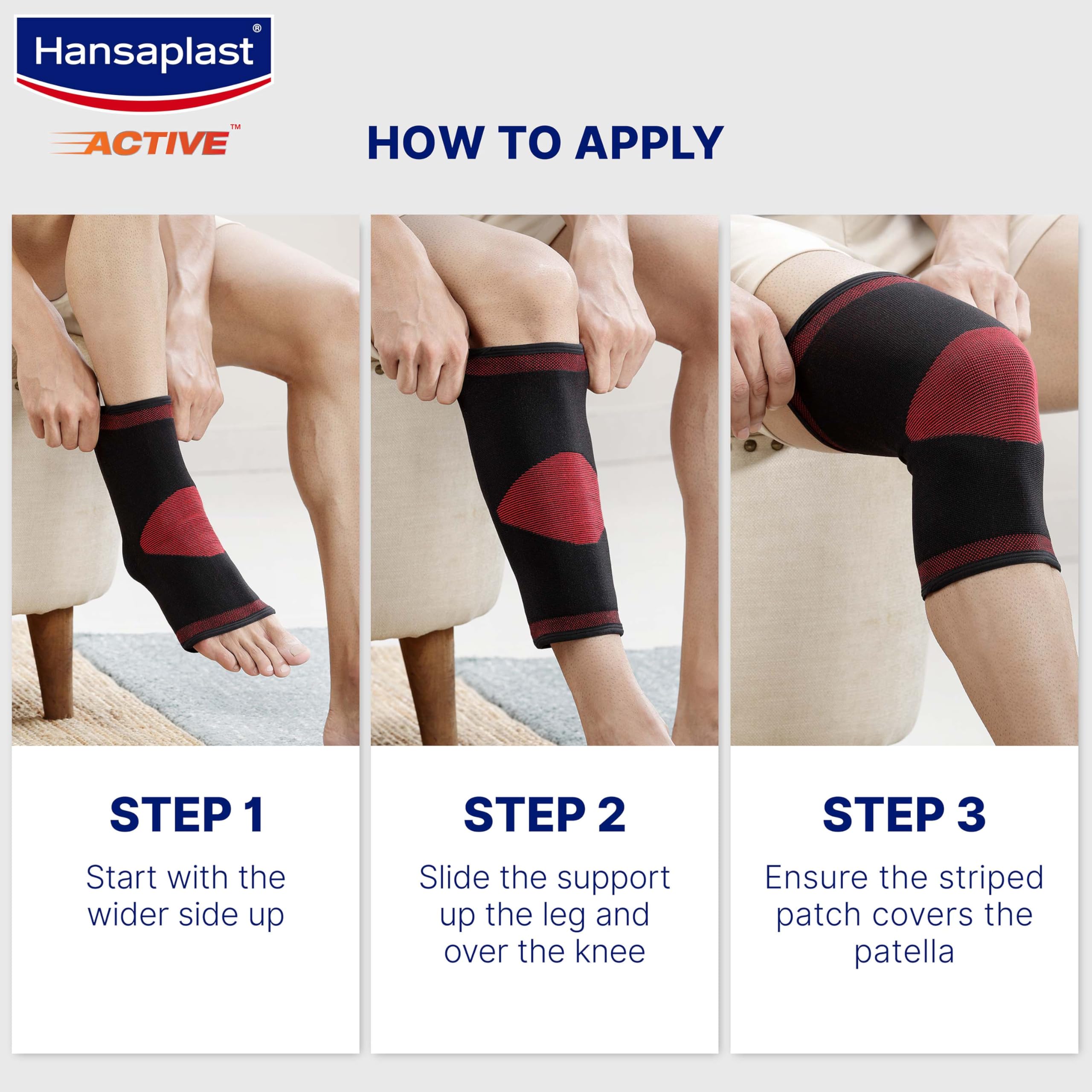 Hansaplast Active for Long Lasting Pain Relief: Modern knee support designed to provide optimal support through targeted compression along with wearing comfort to give Long Lasting Pain Relief so you can continue to stay active and live life uninterrupted. Recommended by Experts: Recommended by the Indian Association of Physiotherapists.Dermatologically Tested and skin friendly non-irritant to the skinTargeted Compression and support through premium knitting technology and optimal support thickness.Anatomically designed with hour-glass shape to give comfort fit.Soft knitting near patella to help reduce pressure. Loose knit at back side to reduce bunching behind the knee and allow ease of motion.Breathable material with cotton inside & nylon outside to provide wearing comfort.4-way stretchable material to provide optimal flexibility.From Germany’s No. 1 Plaster Brand with 100 years of expertise in healing everyday wounds & injuries.