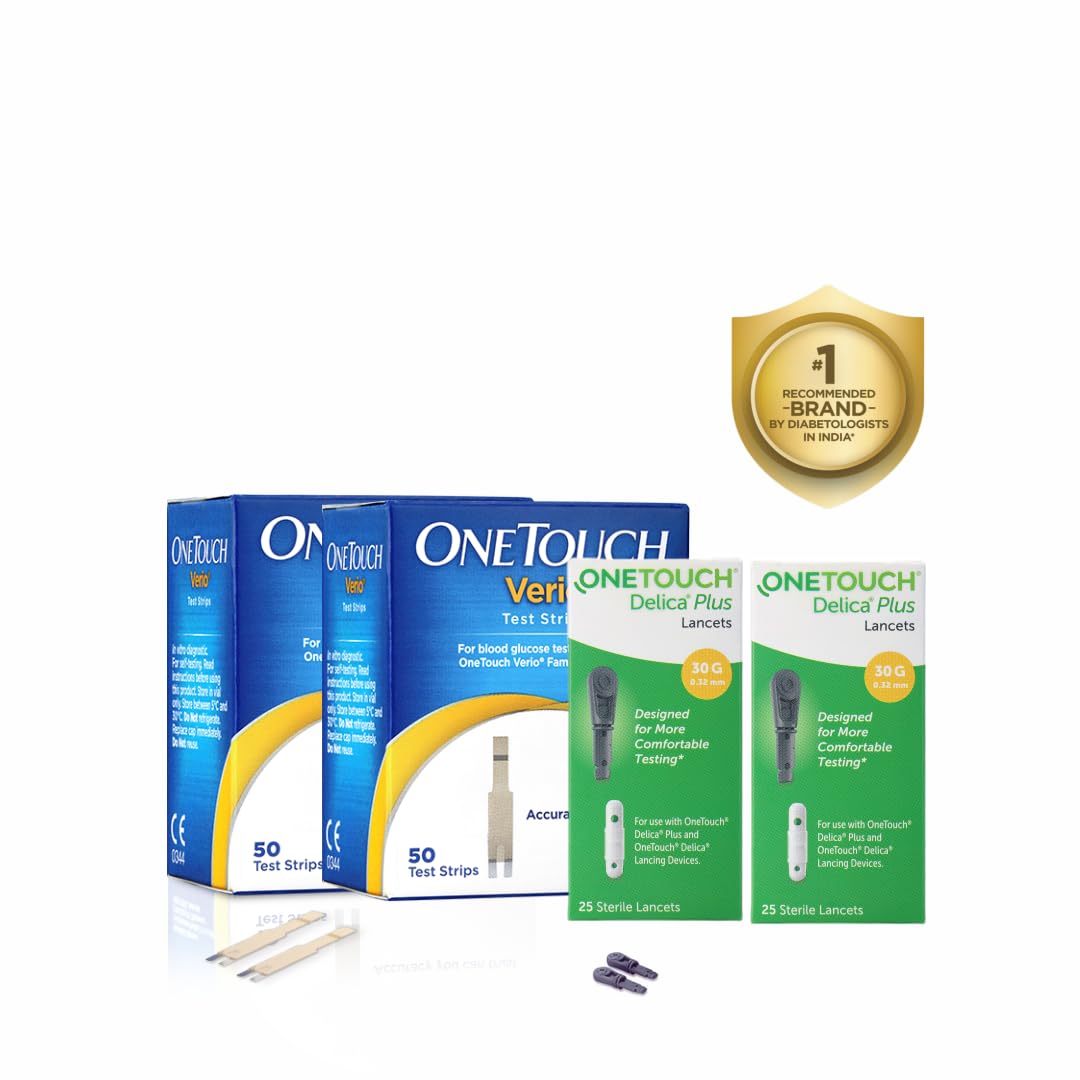 OneTouch Verio Test Strips | Pack of 100 Test Strips along with 50 Delica Plus Lancets | Blood Sugar Test Machine Testing Strips | Global Iconic Brand | For use with OneTouch Verio Flex Glucometer