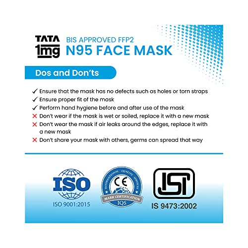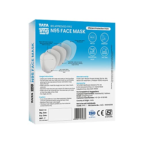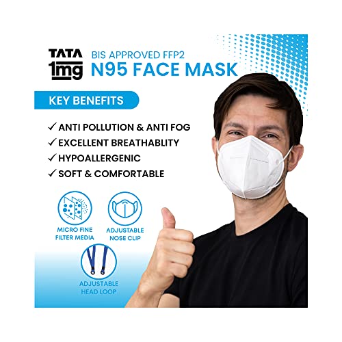 Tata 1mg BIS approved ffp2 N95 masks offer an advanced 5 layer protection from harmful elements. It is an anti-pollution and anti-fog face mask with excellent breathability. Hypoallergenic soft and comfortable. This mask has been rigorously tested and provides excellent protection against bacteria viruses pollution and dust. It has a Bacterial Filtration Efficiency (BFE) of up to 99% and Particle Filtration Efficiency (PFE) of up to 95%. The mask is hypoallergenic and is free of latex PVC and silicone which makes this a viable option for people with sensitivities to these materials. Besides the mask with the head loop is soft comfortable and easy to breathe in. It is lightweight with a soft inner layer for added comfort. Elastic loops are sonic welded inside the outer layers to minimize pressure points. Uses: It is used to protect against bacteriaviruses pollution and dust. Product Specification and Features: It offers advanced 5 layer protection from harmful elements. It is an anti-pollution and anti-fog face mask. This face mask provides excellent breathability. This face mask is hypoallergenic. It is soft comfortable and easy to wear. Directions For Use: Clean your hands with soap and water or hand sanitiser. Put the mask over your nose and mouth by comfortably placing the top loop above the ear and the bottom loop below the ear. Avoid touching the front of the mask when wearing. Do's and Don'ts: Ensure that mask has no defects such as holes or torn straps. Ensure proper fit of the mask. Perform hand hygiene before and after the use of a mask. Do not wear it if the mask is wet or soiled; replace it with a new mask. Do not wear the mask if air leaks around the edges. Replace it with a new mask. Do not share your mask with others germs can spread that way.