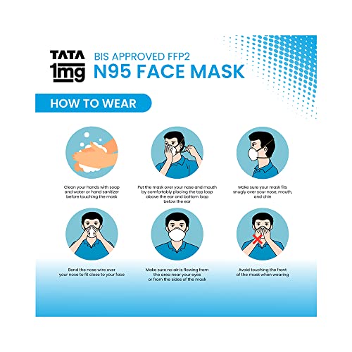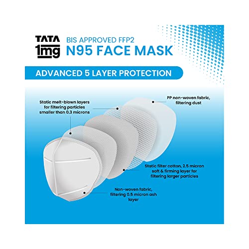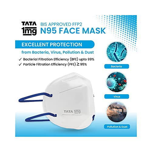 Tata 1mg BIS approved ffp2 N95 masks offer an advanced 5 layer protection from harmful elements. It is an anti-pollution and anti-fog face mask with excellent breathability. Hypoallergenic soft and comfortable. This mask has been rigorously tested and provides excellent protection against bacteria viruses pollution and dust. It has a Bacterial Filtration Efficiency (BFE) of up to 99% and Particle Filtration Efficiency (PFE) of up to 95%. The mask is hypoallergenic and is free of latex PVC and silicone which makes this a viable option for people with sensitivities to these materials. Besides the mask with the head loop is soft comfortable and easy to breathe in. It is lightweight with a soft inner layer for added comfort. Elastic loops are sonic welded inside the outer layers to minimize pressure points. Uses: It is used to protect against bacteriaviruses pollution and dust. Product Specification and Features: It offers advanced 5 layer protection from harmful elements. It is an anti-pollution and anti-fog face mask. This face mask provides excellent breathability. This face mask is hypoallergenic. It is soft comfortable and easy to wear. Directions For Use: Clean your hands with soap and water or hand sanitiser. Put the mask over your nose and mouth by comfortably placing the top loop above the ear and the bottom loop below the ear. Avoid touching the front of the mask when wearing. Do's and Don'ts: Ensure that mask has no defects such as holes or torn straps. Ensure proper fit of the mask. Perform hand hygiene before and after the use of a mask. Do not wear it if the mask is wet or soiled; replace it with a new mask. Do not wear the mask if air leaks around the edges. Replace it with a new mask. Do not share your mask with others germs can spread that way.