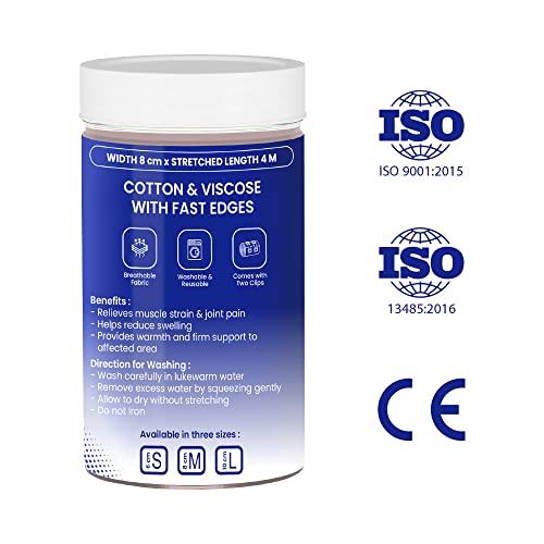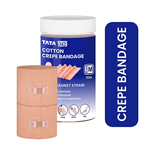 Tata 1mg cotton crepe bandage which relieves muscle strain and joint pain reduces swelling and provides warmth and firm support to the affected area. These bandages come in 3 sizes: S (6 cm) M (8 cm) and L (10 cm) with fastening clips. It is made from super-soft skin-friendly and absorbent material. Tata 1mg Cotton Crepe Bandage is suitable for use as support for sprains and strains in joints and muscles. It works as a moderate compression bandage for knee swelling ankle swelling and other relevant injuries. Uses: It relieves muscle strain and joint pain. It helps reduce swelling. It provides warmth and firm support to the affected area. Product Specifications and Features: It is super soft and comfortable to wear it is made from a skin-friendly and absorbent material and it offers firm support and compression to the affected area.