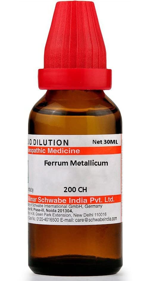 Dr Willmar Schwabe India Ferrum Metallicum Dilution is the homoeopathic medicine that is helpful for the treatment of headaches oversensitiveness blood circulation ailments and palpitation. This medicine is made from powdered iron and a rich source of dietary iron. It is a good medication against excess sweating anaemia and weak pulse. It helps in healing severe headache associated with ringing sensation in ears before menses. It is effective in treating many stomach related issues such as appetite gastric problem nausea vomiting frequent belching with small vomit soreness in the abdomen and burning in stomach. It is highly effective in regulating scanty or irregular menses.