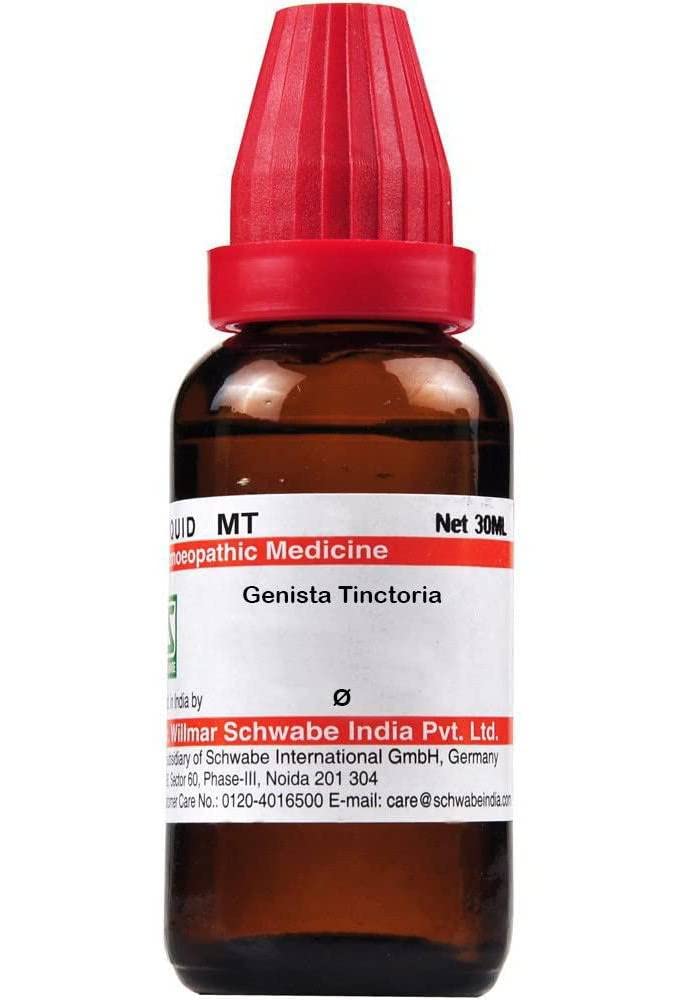 Dr Willmar Schwabe India Genista Tinctoria Dilution: contains Scopolamine which is helpful in curing dry throat water brash problems. This medicine is also helpful in curing severe illness and effective in curing collapse. This medicine is effective in weariness from no assignable cause and it does not cause much pain.