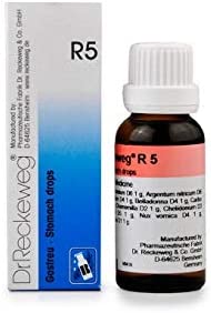 INDICATIONS Acute and chronic gastritis, dyspepsia, chronic relapsing gastritis with or without ulceration. Especially ulcus parapyloricum. Heartburn, bad taste in mouth, frequent belching, flatulence, meteorism. Acts on the inflamed mucosa of stomach, on the physiology of stomach. MODE OF ACTION OF MAIN INGREDIENTS: Anacardium: Gastric complaints, improving after eating, pains around midnight.Argentum nitricum: Epigastric complaints, noisy and frequent belching with temporary improvement.Arsenicum album: Remedy for mucous membrane, burning pain in the stomach with vomiting.Belladona: Epigastric sensitivity to pressure and other disturbances, nausea, vomiting.Carbo vegetabilis: Sensation of repletion in abdominal cavity, asthenia and exhaustion.Chamomilla: Nervous hypersensitivity and irritability. Swelling of the stomach.Chelidonium: Effective for liver and bile, choleretic, improvement of gastric disorder by ingestion.Lycopodium: Gastro-intestinal disturbances, bitter taste in mouth, lack of appetite, constipation, flatulent colic.Nux vomica: Nervous irritability, hypochondria, stomach constriction, disturbances due to nicotin.Scrophularia nodosa: Griping pains in abdomen, hyperacidity improving after eating.In some patients, sensitive to drugs, the pains may grow worse after a few days of treatment, which is the socalled primary reaction. In such cases it will be advisable to discontinue the treatment completely for 1-2 days. Resumption of treatment will result in continued improvement. In other cases follow treatment with intermissions, or reduce the dose, or give the drops on a full stomach.It is characteristic in the use of Dr. Reckeweg R5, to see the usual relapses decrease progressively in graveness and frequency, until they disappear completely. DOSAGE - Generally 3 times a day 10-15 drops in some water before meals. - After complete disappearance of the symptoms, in order to prevent relapses and to regularize the neuro-vegetative system, once a day 10-15 drops in some water before the main meal.