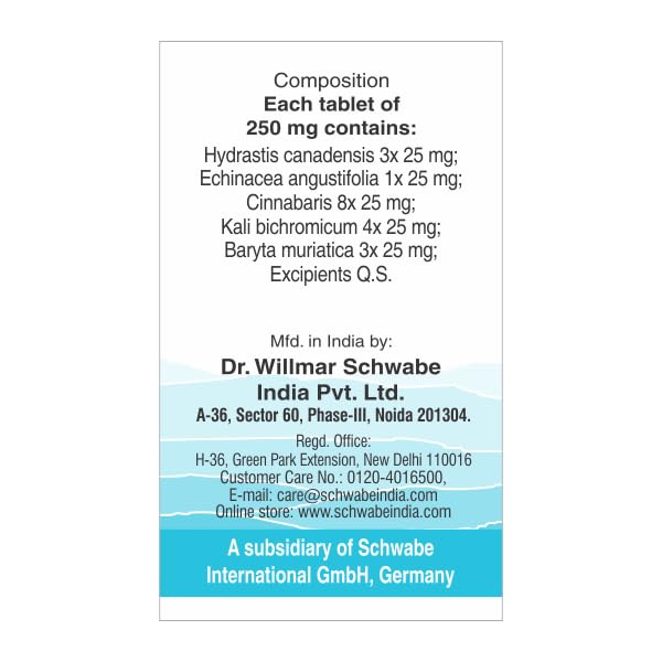 Composition: Each Tablet Of 250 Mg Contains: Hydrastis Canadensis 3X 25 Mg Echinacea Angustifolia 1X 25 Mg Cinnabaris 12X 25 Mg Kalium Bichromicum 4X 25 Mg Baryta Muriatica 3X 25 Mg Excipients Q.S. To Make 250 Mg