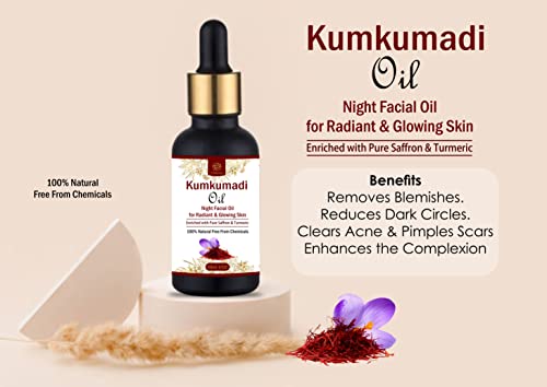 Kumkumadi Oil Night Facial Oil is a luxurious and effective solution for achieving radiant and youthful skin. Enriched with pure saffron and turmeric and blended with nourishing olive oil and almond oil this 100% natural and chemical-free facial oil offers deep nourishment and rejuvenation. Its powerful ingredients work together to enhance skin tone reduce signs of aging and provide a luminous glow. Perfect for all skin types this night facial oil helps to repair and revitalize your skin while you sleep ensuring you wake up with a refreshed and glowing complexion. Embrace the natural beauty benefits of Kumkumadi Oil and enjoy a holistic approach to radiant and youthful skin.