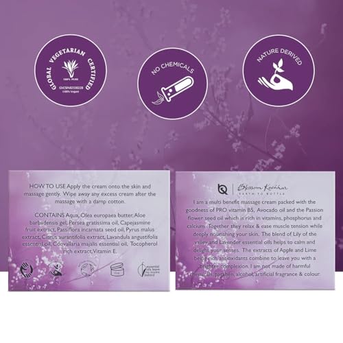 100 percent free of petrochemicals phthalates toxic ingredients artificial colouring and fragrances. Am a multi benefit massage cream packed with the goodness of pro vitamin b5 avocado oil and the passion flower seed oil which is rich in vitamins phosphorus and calcium. Together they relax and ease muscle tension while deeply nourishing your skin. The blend of lilly of the valley and lavender essential oils helps to calm and delight your senses. The extracts of apple and lime being rich antioxidants combine to leave you with a lighter and brighter complexion.