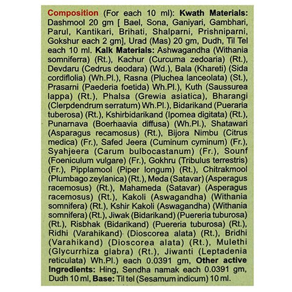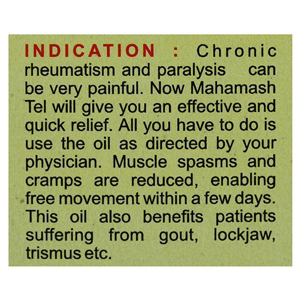 Baidyanath Mahamas Taila: 100 mlIt is an Ayurvedic supplement , may Helps to relieve stiffness and pain in locked jaw.Ingredients:Sesame Indicum, Evolvulus Alsinoides, Adhatoda Vasica, Terminalia Arjuna, Cedrus Deodara, Curcuma Longa, Berberis Aristata, Terminalia Chebula, Emblica Officinalis, and Santalum Album.Usage:For oral administration, the usual dosage is 5 10 drops once or two times a day before food with hot water or as directed by the Ayurvedic expert.Legal Disclaimer: Statements regarding dietary supplements have not been evaluated by the FDA.Note: Product images are for illustrative purposes only. Images/packaging/ labels may vary from time to time due to changes made by the manufacturer's manufacturing