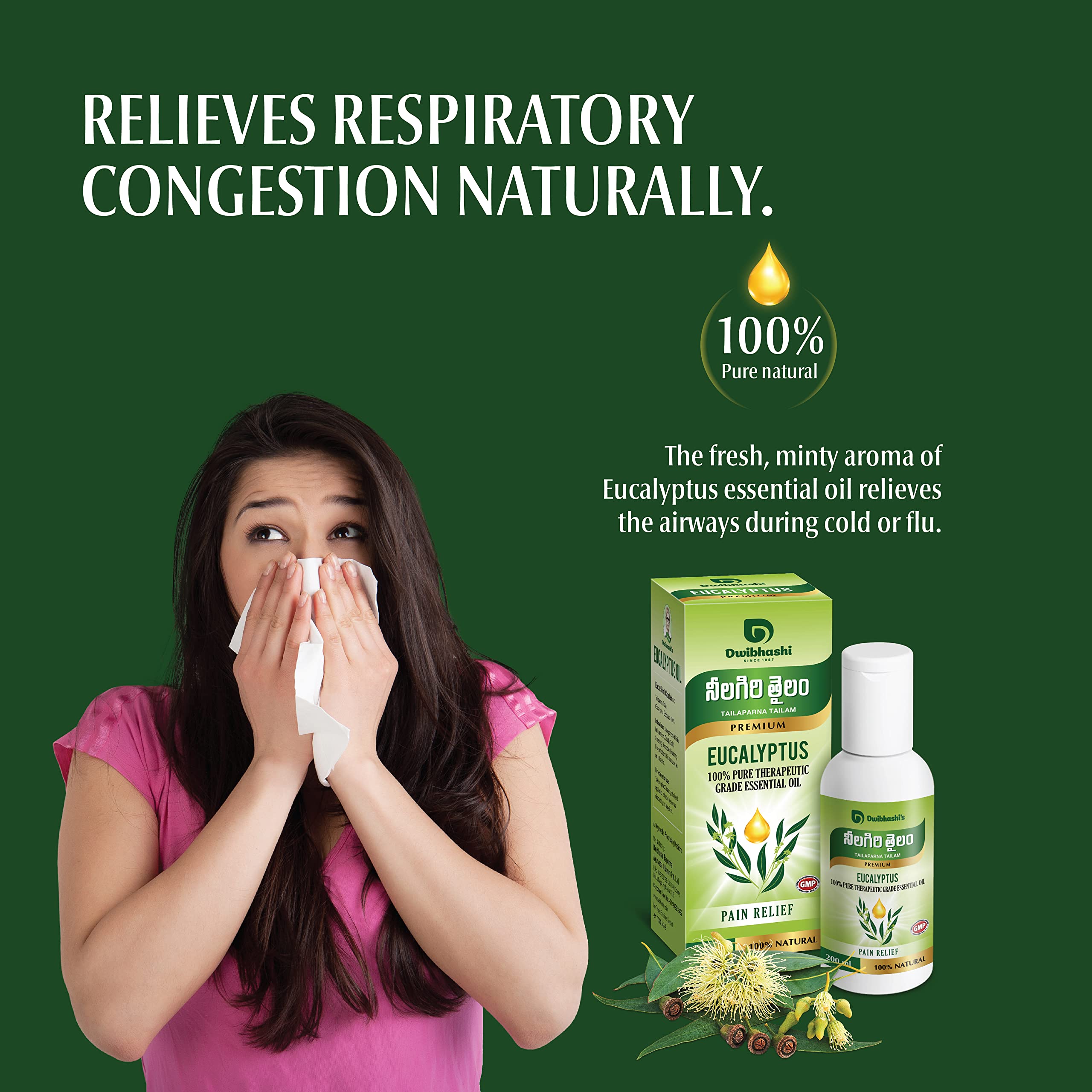 Dwibhashi Eucalyptus Oil(Nilgiri thailam) | 100% Natural & Pure for Steam Inhalation Diffuser Cold Cough & Beauty 200 ml