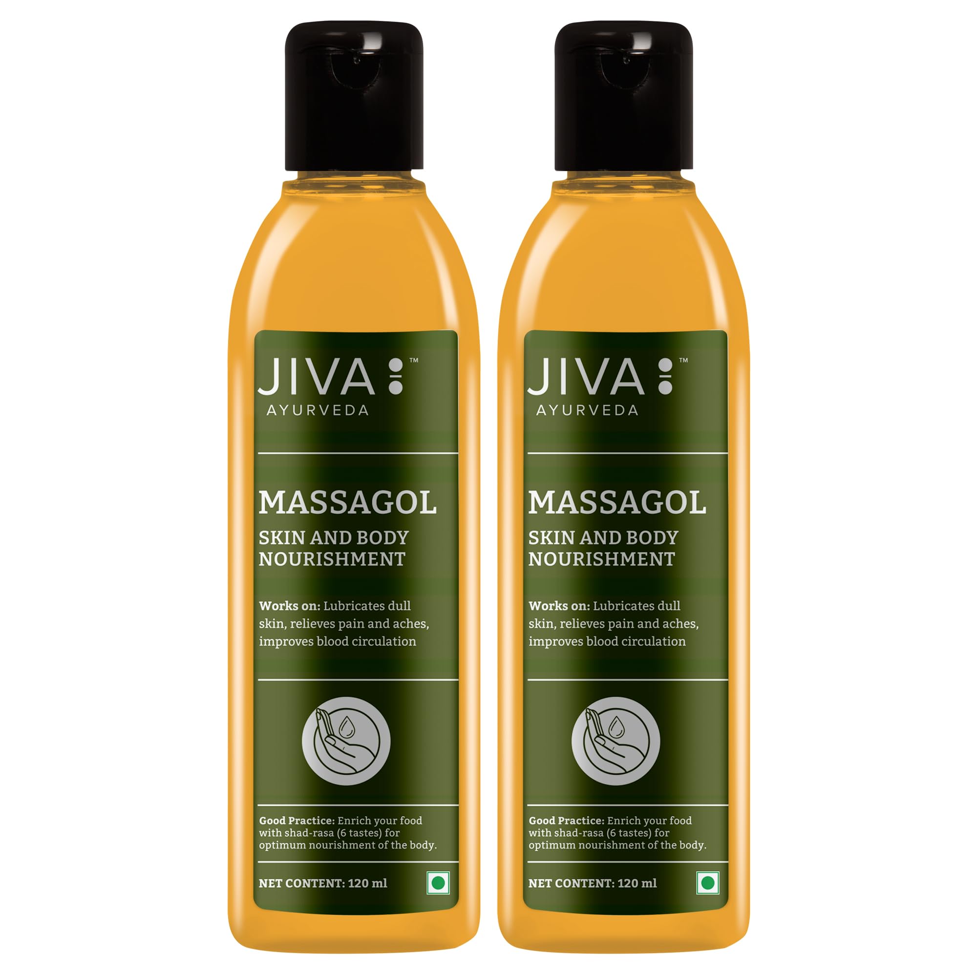 Jiva Massagol Oil 120ml | 100% Ayurvedic Formula | Reduces Muscular Stiffness & Pain | Rejuvenates Nervous System | Enhances Blood Circulation, And Prevents Sagging Skin & Wrinkles (Pack Of 2)