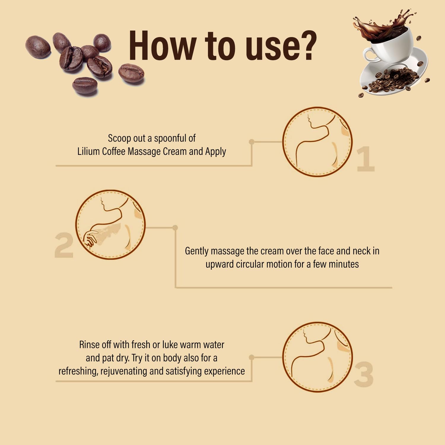 Lilium Coffee Massage Cream a rejuvenating blend designed to elevate your skincare rountine. Infused with the finest Arabica coffee benas This Cream offers a sensory escape while providing numerous benefits for your skin.