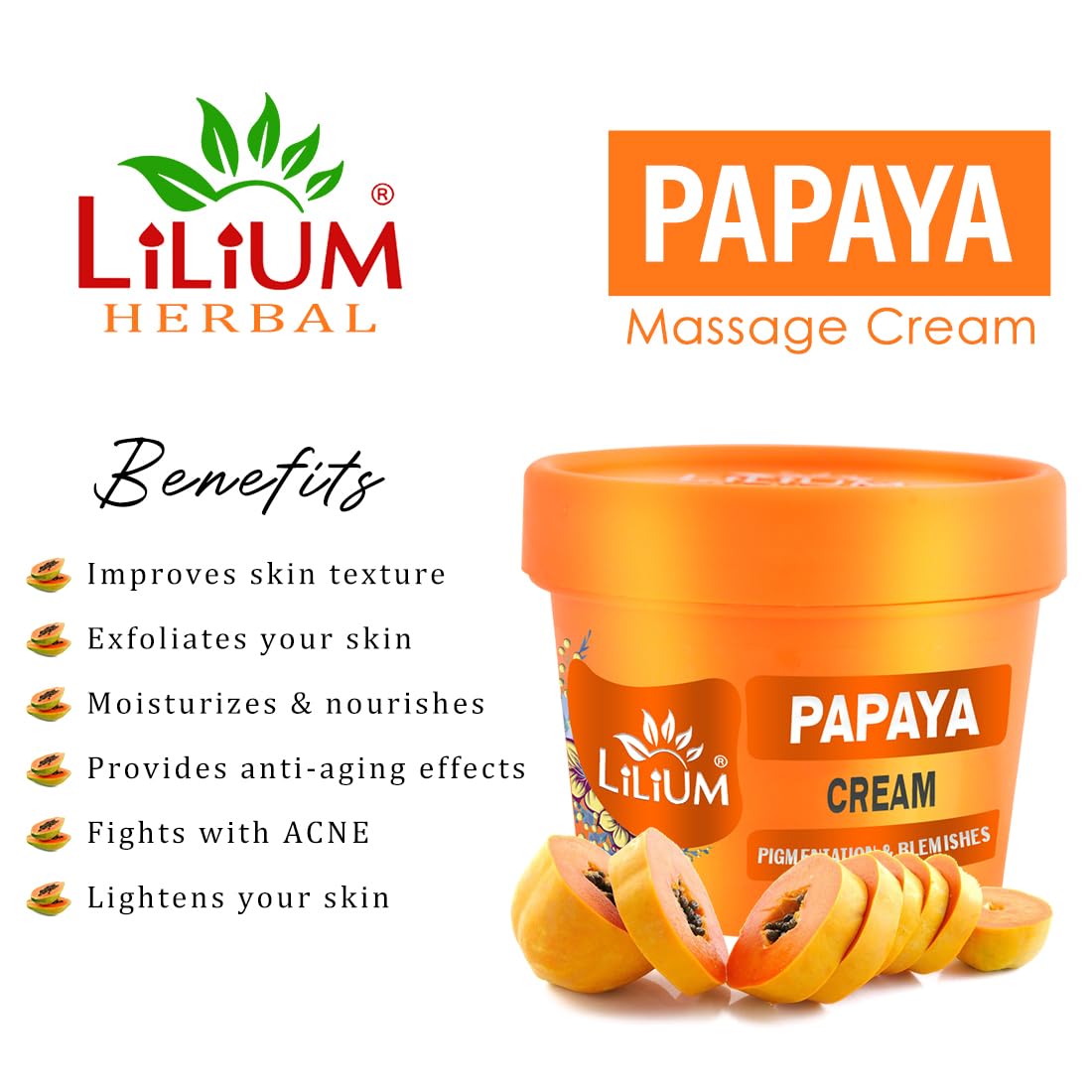 Lilium Papaya massage cream is a skincare essential that harnesses the natural power of papaya a tropical fruit celebrated for its incredible skin benefits. Papaya is a rich source of vitamins A C and E which are known for their skin-nourishing properties. These vitamins work together to hydrate and rejuvenate your skin leaving it feeling soft supple and deeply moisturized