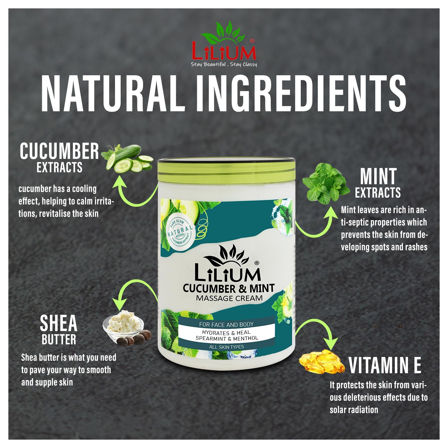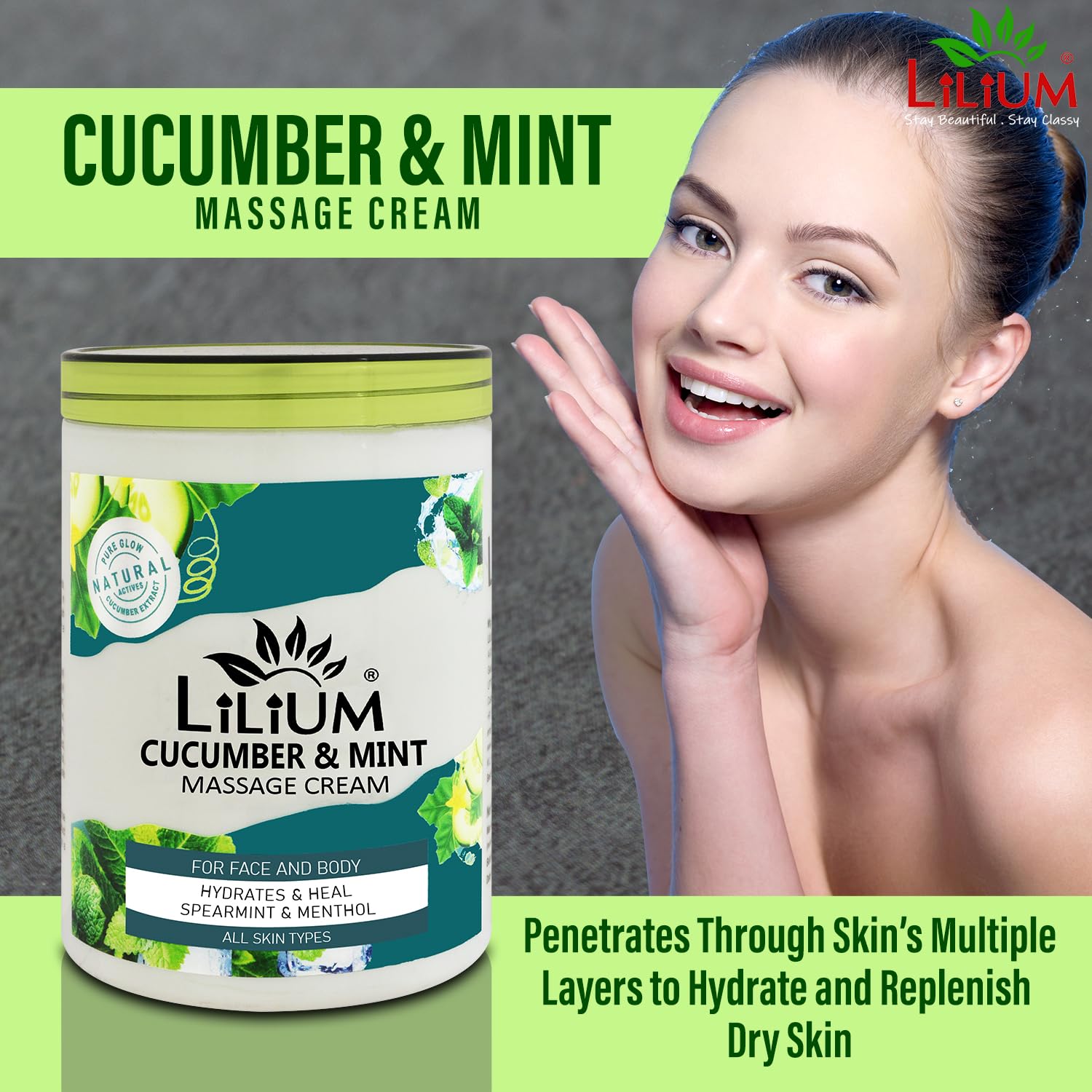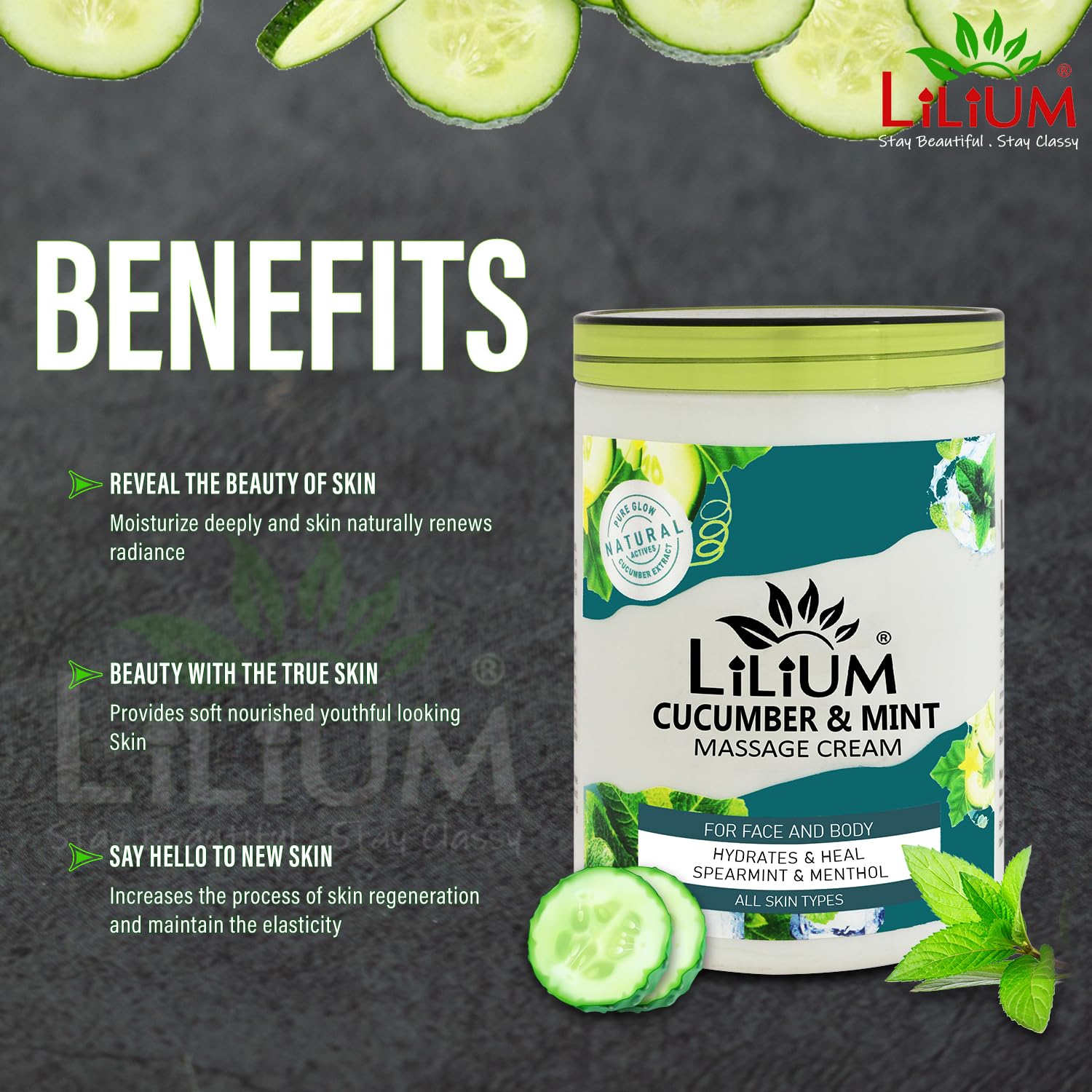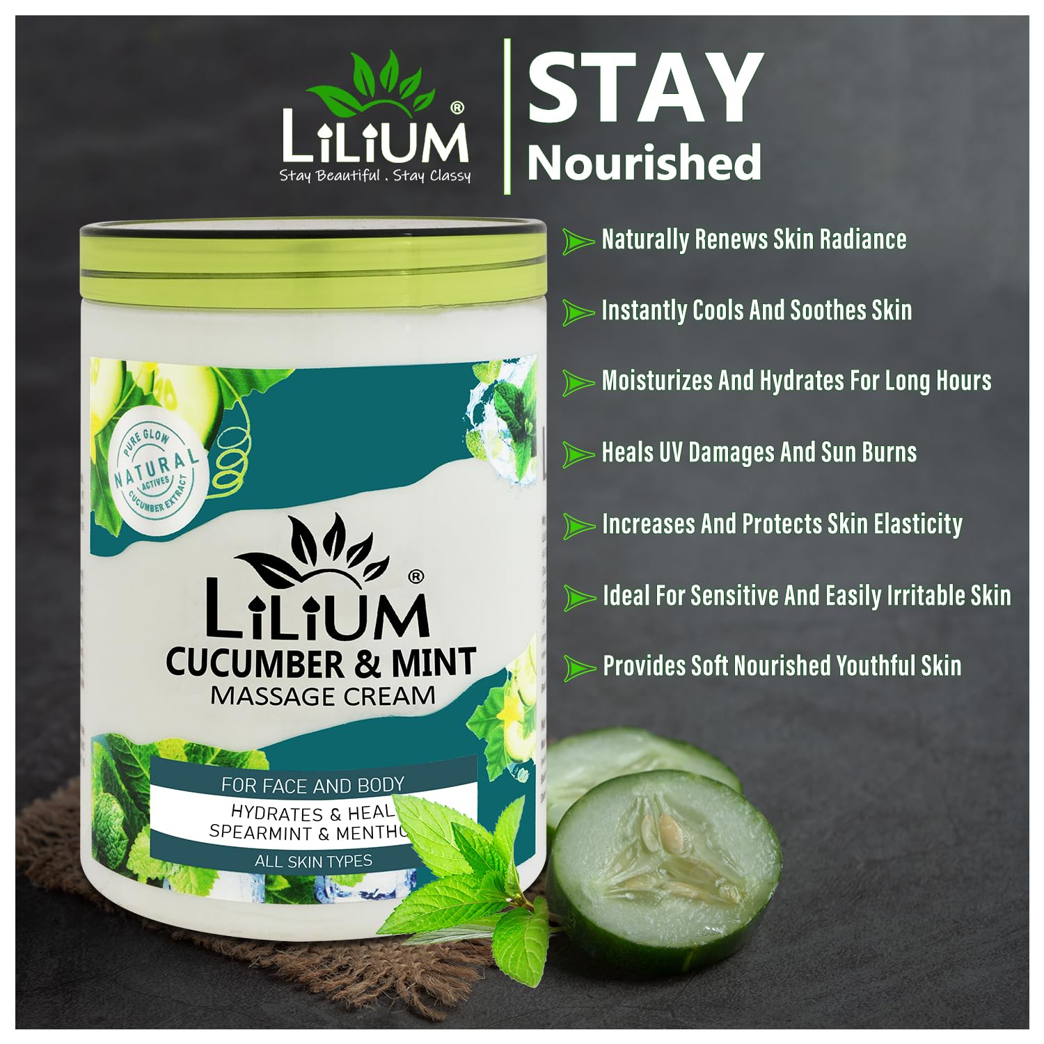 Lilium Refresh & Renew Massage Cream Cucumber & Mint 900ml | For Face & Body Hydrates & Heal Spearmint & Menthol Cool Fresh & Hydrated Skin 24X7 | Heal UV Damages & Sun Burns | All Skin Types