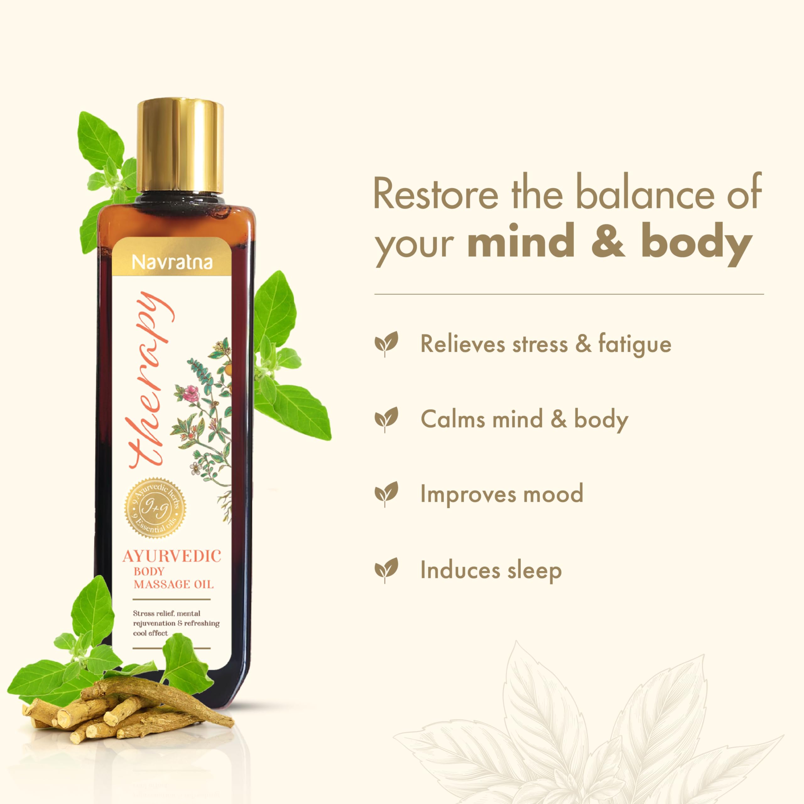 Crafted with care using a special mix of 9 Ayurvedic herbs and 9 aroma therapy oils the Navratna Therapy Body Massage Oil is like a wellness treasure chest. It taps into the calming power of ashwagandha the refreshing vibes of Brahmi the delightful scent of orange oil and the soothing feel of eucalyptus oil. Together they team up in this ayurvedic stress relief oil to help you deal with stress and feel refreshed. Just a quick body oil massage with this rejuvenating massage oil can melt away the knots in your muscles and make your mind feel calm and peaceful.