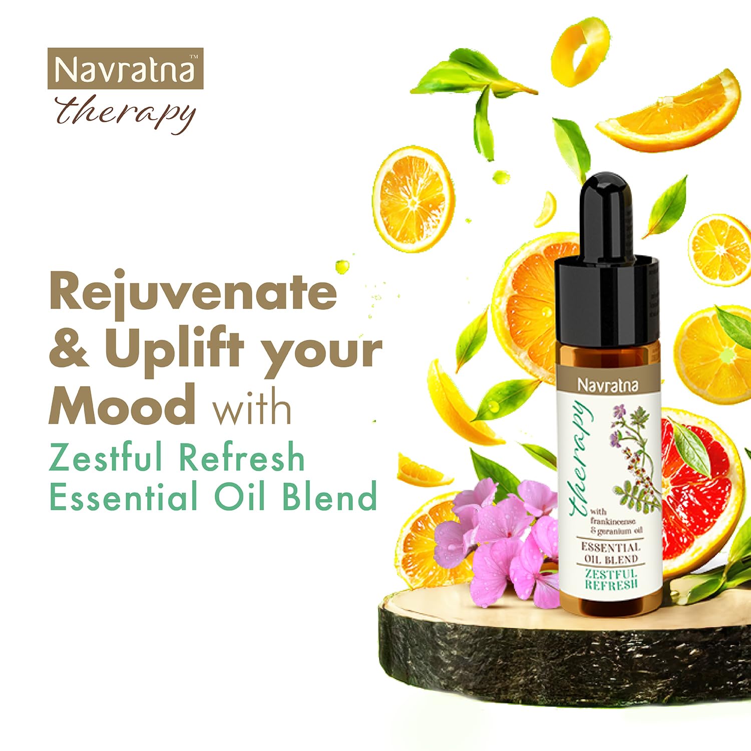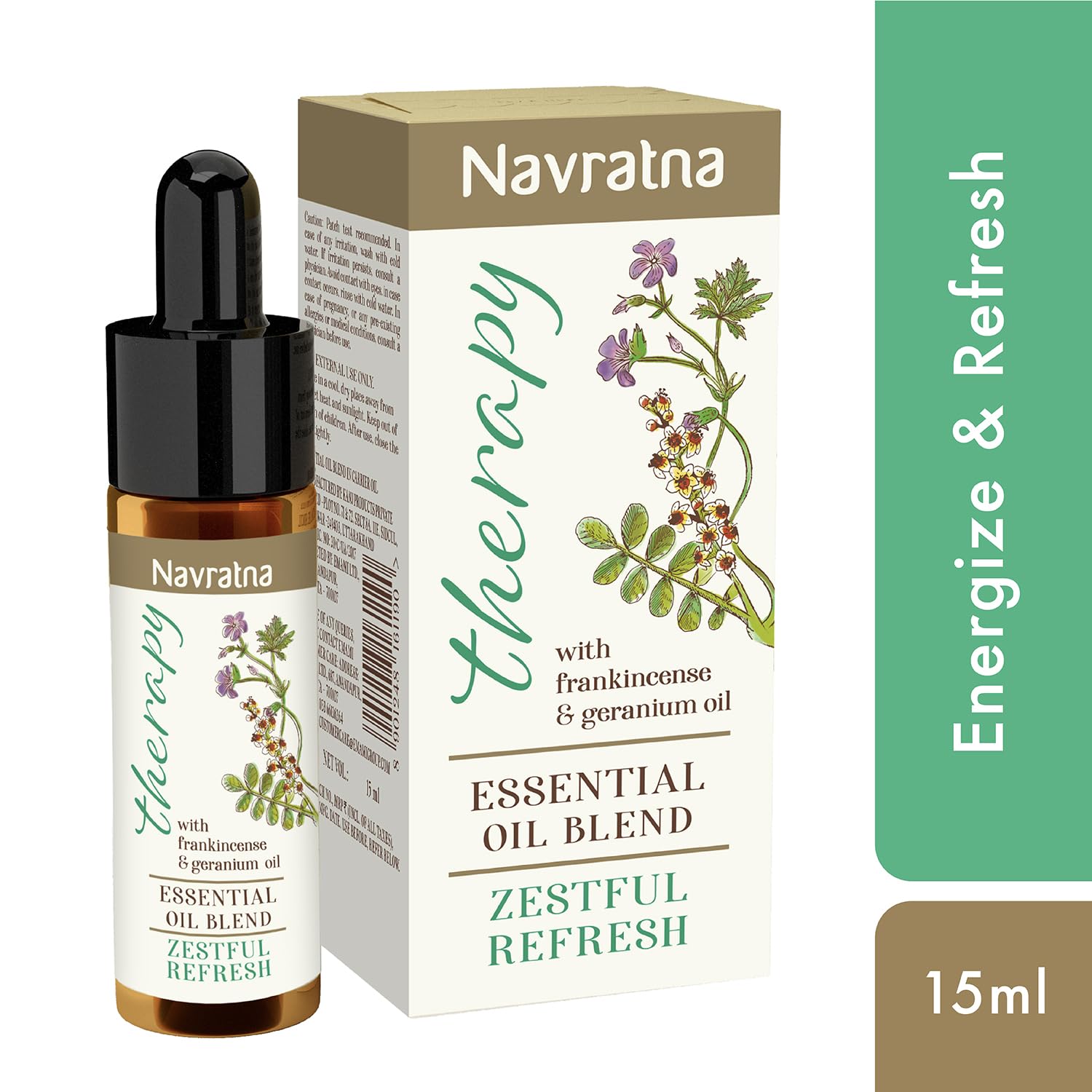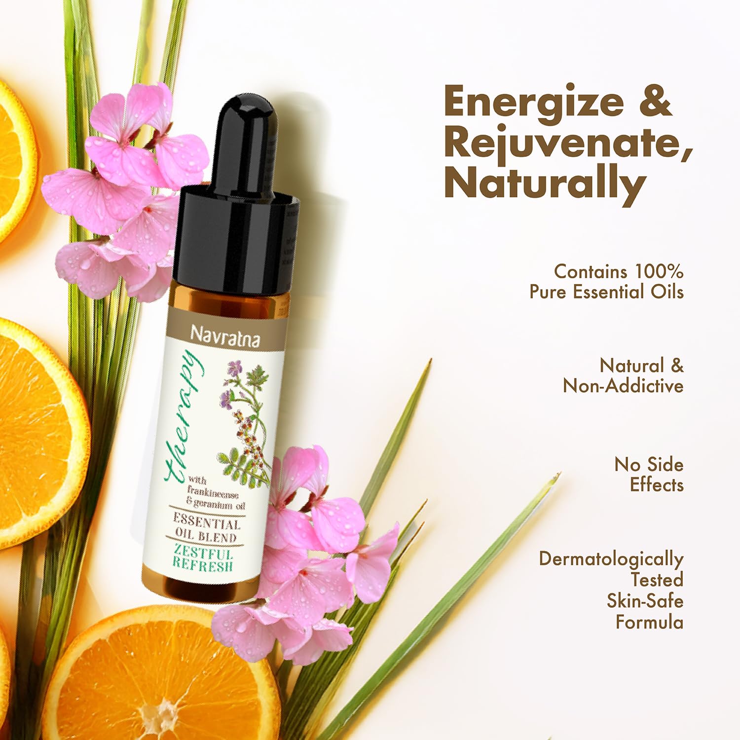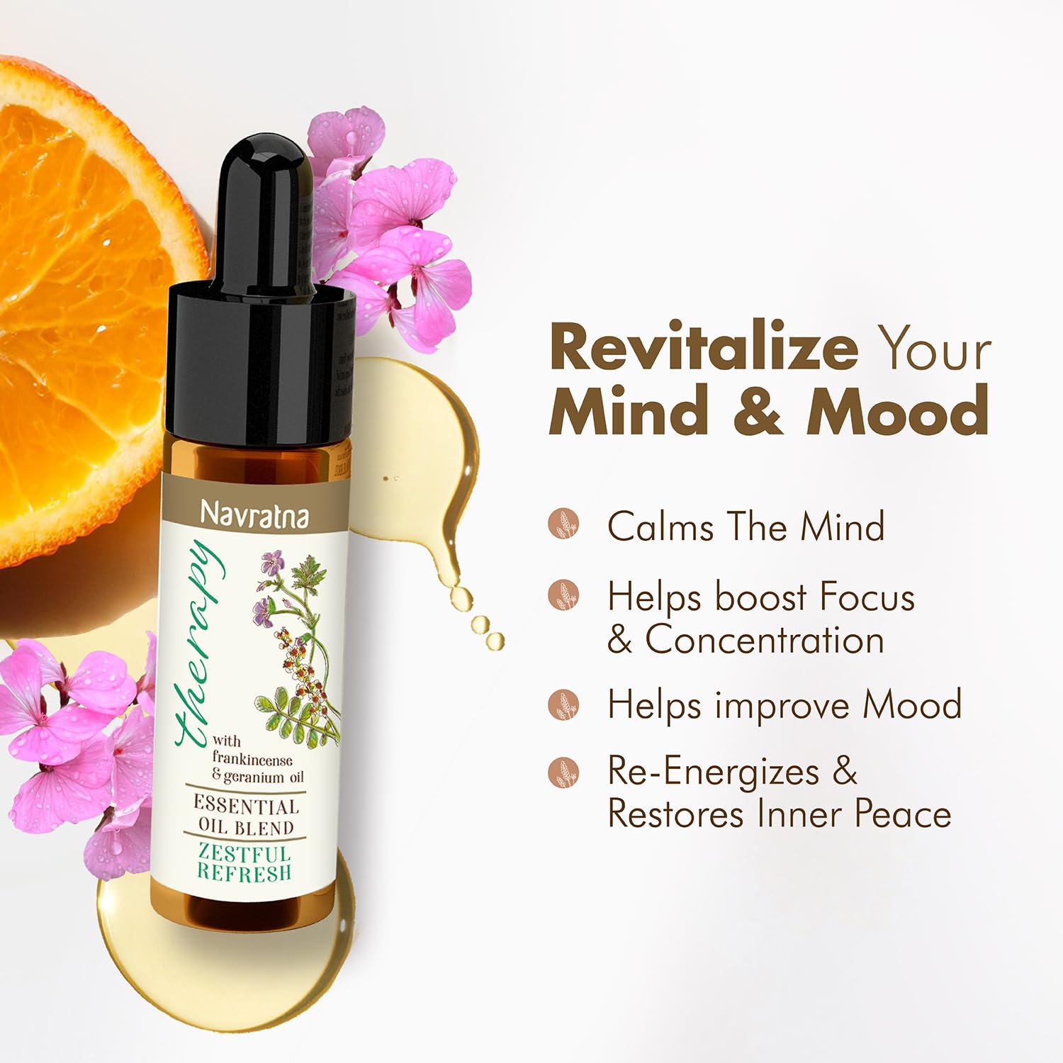 Navratna Therapy Zestful Refresh Essential Oil Blend | With Frankincense oil & Geranium Oil | Rejuvenating Oil for Energizing the mind | Refreshes the mind & promotes focus | Mood Uplifting Aromatherapy Oil 15 ml