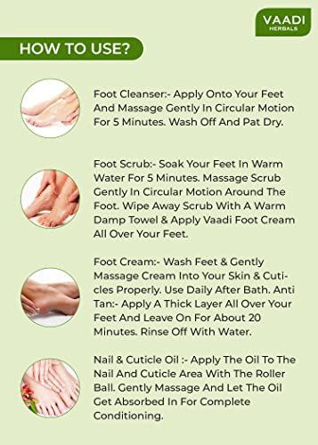 A divine combination of various herbs and aromatic oils this kit is all set to pamper and beautify your hands and feet. It will cleanse moisturize and smoothen the skin on your hands and feet and take good care of your nails too. Foot CleanserThis scientifically designed foot cleanser is enriched with numerous herbal ingredients that effectively cleanse your skin and improve blood circulation. It imparts a cool feeling which relieves stress and fatigue.Active IngredientsGrapeseed extract Lemon Peel Extract Orange Peel Extract Honey Lavender Oil.Foot ScrubThis uniquely designed foot scrub scientifically uses precious herbs & scrubs to effectively exfoliate dead foot tissues & rejuvenates the rough & damaged foot skin. Makes your feet super soft & supple.Active IngredientsFenugreek Jojoba Seed Grains Lemon Grass Oil Walnut Scrub Turmeric Kokum Butter.Foot CreamA scientifically designed foot cream that repairs & softens rough hard & cracked heels. Clove Oil has antiseptic properties that disinfect your feet. Cocoa Butter & Jojoba Oil deeply moisturize your feet making them super soft. Sandalwood Oil soothes & relaxes tired feet.Active IngredientsThyme Clove Oil Sandalwood Cocoa Butter Jojoba OilAnti Tan Foot MaskThis uniquely designed Anti Tan Foot Mask is enriched with anti tan and skin rejuvenating agents that effectively hydrate and repair damaged foot skin. Removes pigmentation marks and signs of ageing.Active IngredientsManjistha Lemon Grass Oil Sandal Paste Apricot Oil.Nail & Cuticle OilEffectively moisturizes and conditions the nail wall and cuticle area of the nail. It prevents cracking and peeling of cuticles making them soft and smooth. It strengthens thin weak nails by treating dry damaged cuticles at the root.Active IngredientsApricot Kernel Oil Jojoba Oil Vitamin A&E Shea Butter.