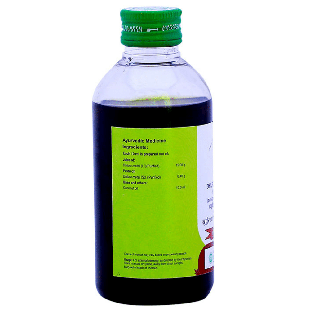 Vaidyaratnam Dhurdhoorapathradi Kera Thailam: 200 mlLegal Disclaimer: Statements regarding dietary supplements have not been evaluated by the FDA and are not intended to diagnose, treat, cure, or prevent a
