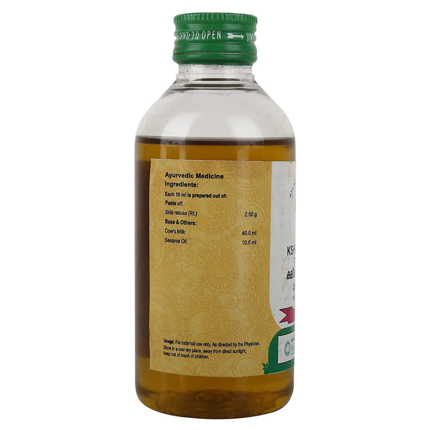 Vaidyaratnam Ksheerabala Thailam 200 mlHow to use :For oral intake, if capsule, the usual dose is 2 capsules 2 times a day before food. It is usually administered along with hot water, which may help in quick absorption.If it is plain oil and indicated for oral intake, it is given in a dose of 5 10 drops once or twice a day, usually before food. The patient is asked to drink a glass of warm water following the oil.Legal Disclaimer: Statements regarding dietary supplements have not been evaluated by the FDA.Note: Product images are for illustrative purposes only. Images/packaging/ labels may vary from time to time due to changes made by the manufacturer's manufacturing batch and location. The product description is for information purposes only and may contain additional ingredients.