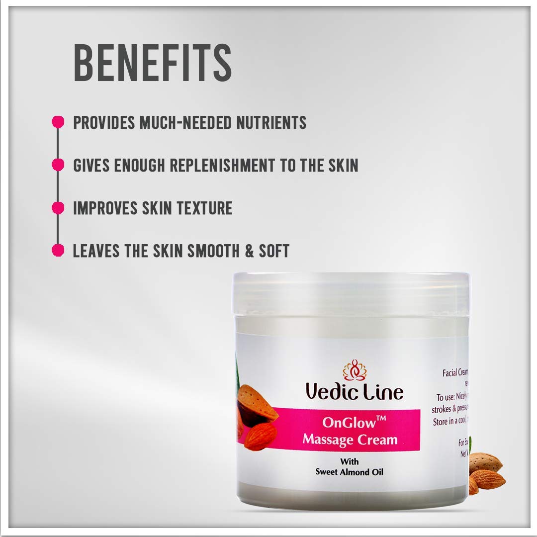 • Vedicline face massage cream includes sweet almond oil which has been related to certain possible skin benefits such as enhanced complexion skin tone healing dry skin and reducing the appearance of scars.