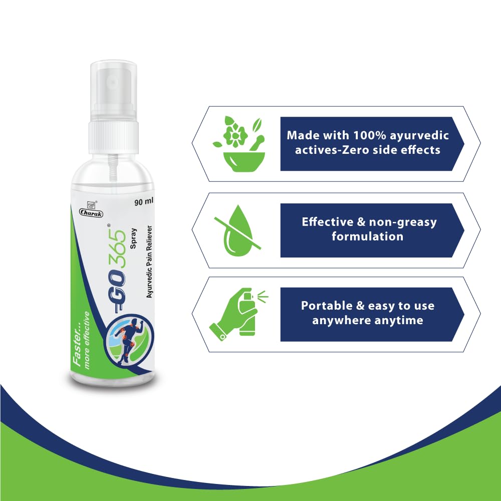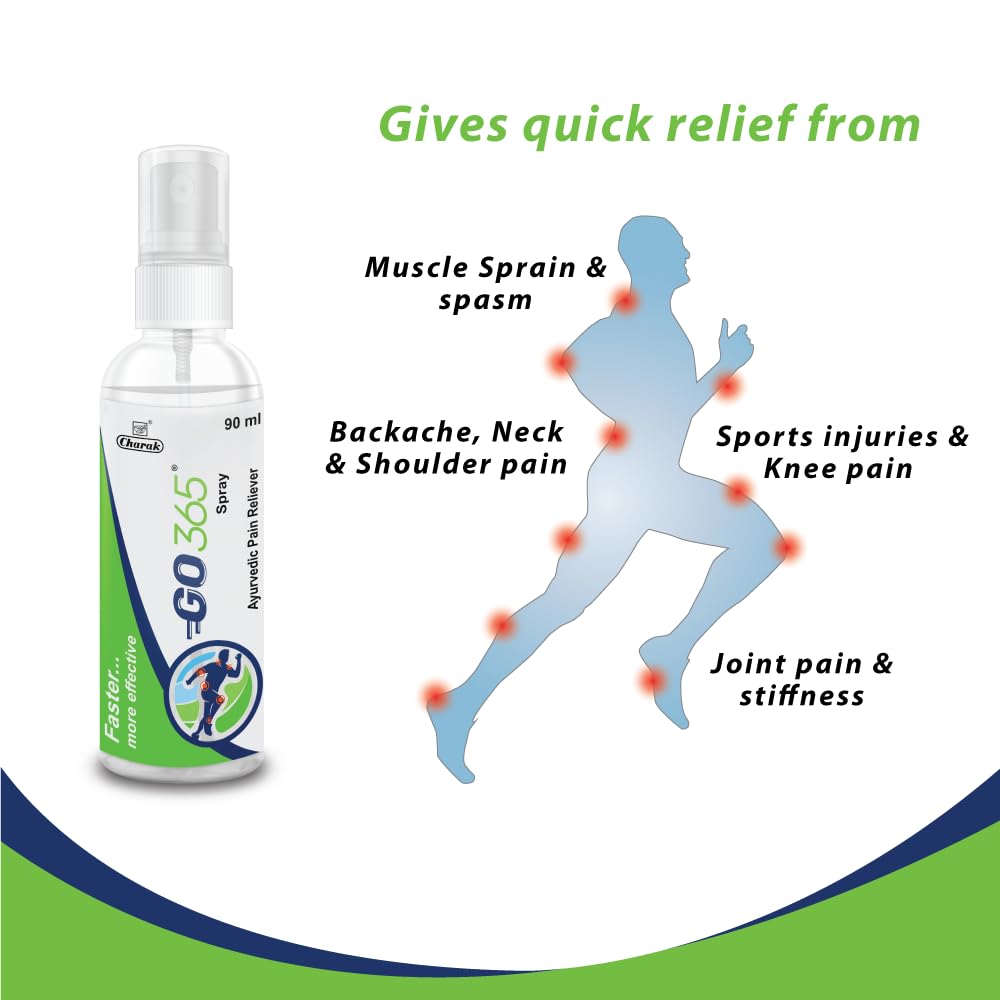 Charak Go365 Pain Reliever Spray | For Back Muscle Knee & Joint Pain & Stiffness | For Sports & Gym Injuries Each 90Gm (Pack Of 3)