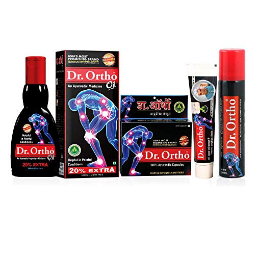 Dr Ortho Combo Pack (1 Oil 120ml 30 Capsule 1 Spray 75ml & 1 Ointment 30gm). Safeguard your joints with the goodness of effective herbal oils and nurture them with the touch of Ayurveda. This Oil is made with the formulation of Alsi Oil Kapoor Oil Pudina Oil Cheed Oil Gandhapura Oil Nirgundi Oil Jyotishmati Oil and Til Oil. Dr. Ortho Ayurvedic oil is highly effective in relieving stiffness pain and inflammation in joints.